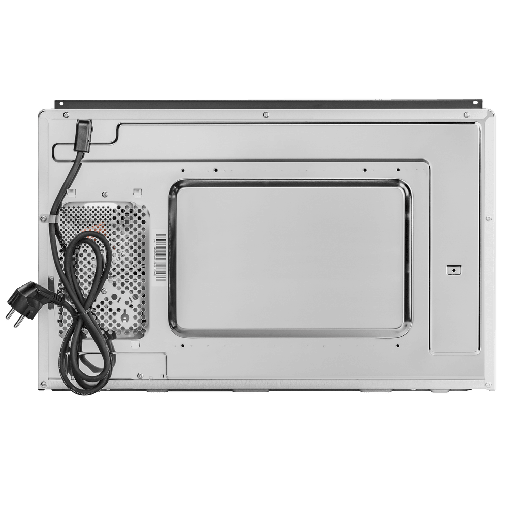 Функционально прибор рассчитан на встроенную установку: габариты 38.6×59.4×32 см и рекомендуемая ниша 38.4×56—56.8×55 см позволяют компактно разместить его в колонне вместе с другой техникой. Объём камеры 20 литров и вращающееся стеклянное блюдо диаметром 24.5 см подходят для повседневной готовки и небольших порций. Магнетрон развивает мощность до 800 Вт с пятью ступенями установки, а электрогриль мощностью 1000 Вт используется для зарумянивания корочки. Доступны режимы отдельно микроволн и гриля и комбинированный режим микроволны+гриль.