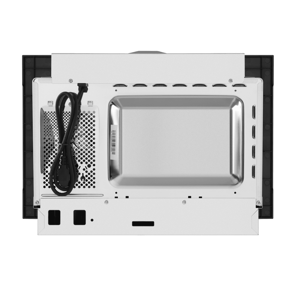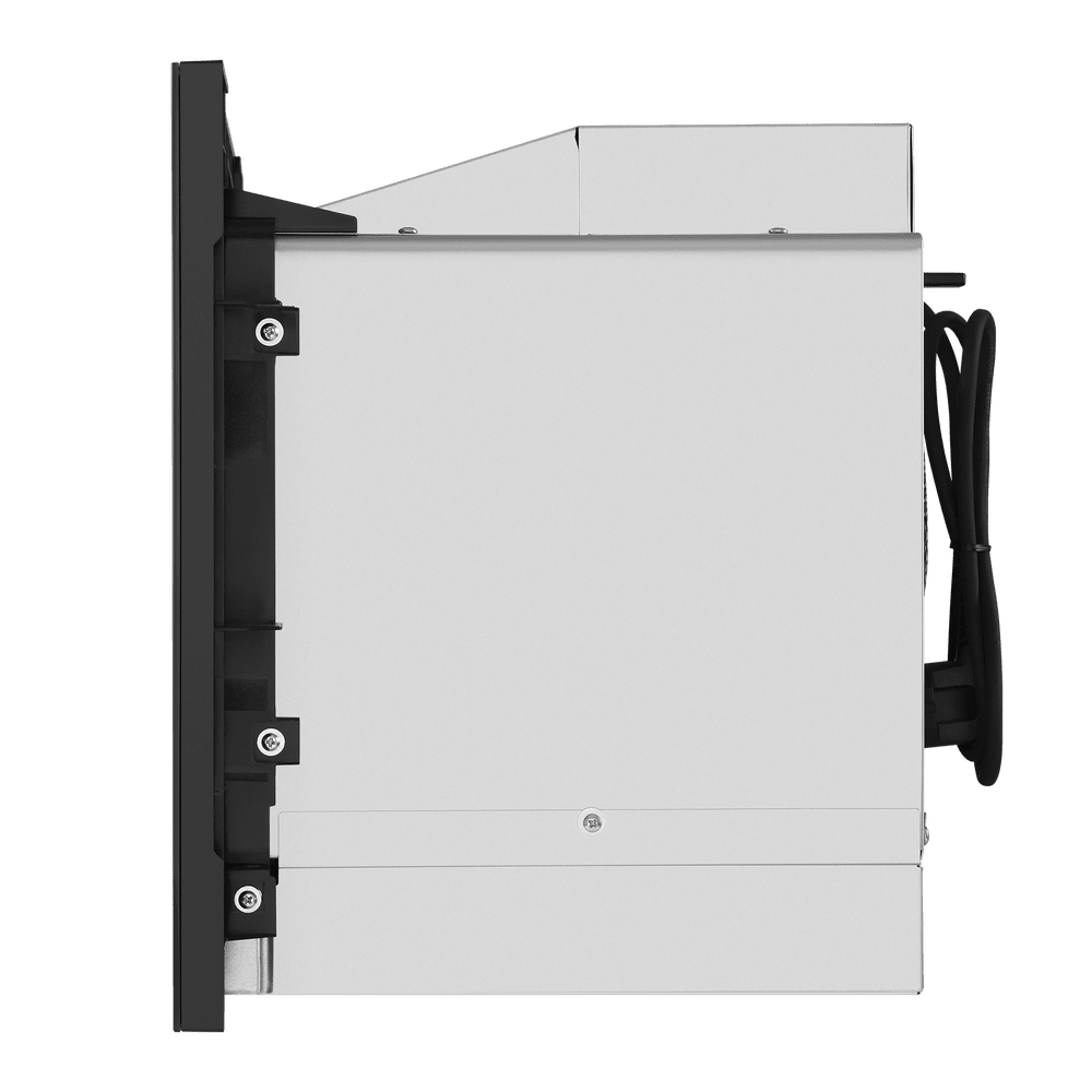 Внешне прибор выдержан в глубоких черных тонах: глянцевый фасад и черная фурнитура создают благородный, спокойный акцент на кухне. Откидная дверца с нижним упором и кнопочным механизмом открывания смотрится лаконично и удобно — достаточно легкого нажатия, чтобы добраться до содержимого. Внутренняя камера с покрытием из нержавеющей стали подчёркивает практичность, а встроенная подсветка облегчает контроль за процессом приготовления. Стандартная ширина и уменьшенная глубина делают прибор компактным, но устойчивым к нагрузке.