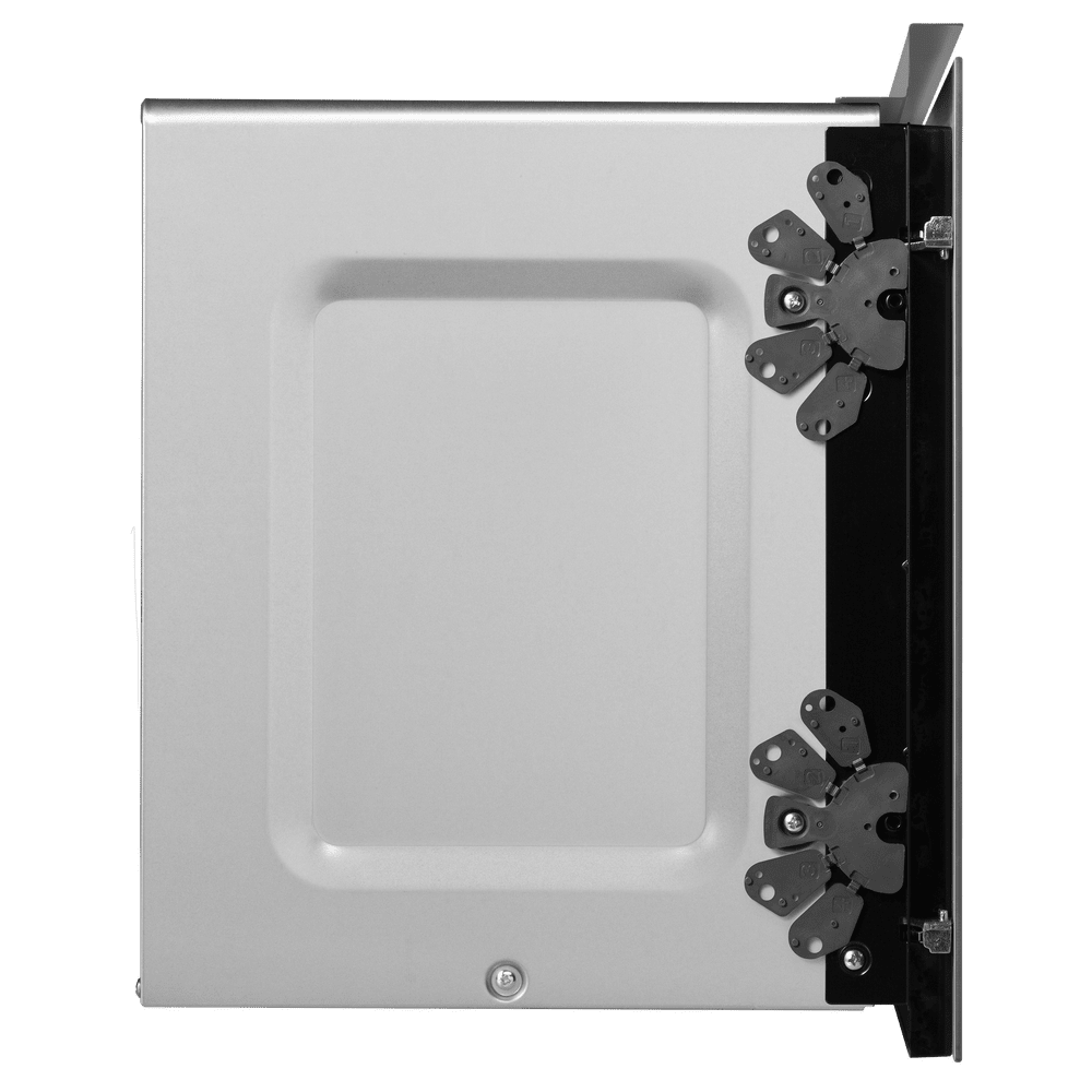 Микроволновые печи могут иметь навесную или откидную дверцу. Модели с навесной дверцей, запирающейся на механические защелки, могут быть как встраиваемыми, так и отдельно стоящими. Такие СВЧ-печи с дверцей, открывающейся влево или вправо, могут относиться к любой категории цен: от самых простых и дешевых до премиальных моделей. Недостатки дверцы с петлями сбоку — выступающая ручка, которая затрудняет очистку фасада, и небольшой угол открытия не более 90 градусов, который может препятствовать, например, размещению прибора в углу. Если ручка действительно мешает, стоит выбрать модель, дверца которой открывается нажатием на кнопку или прикосновением к сенсору на боковой панели управления.