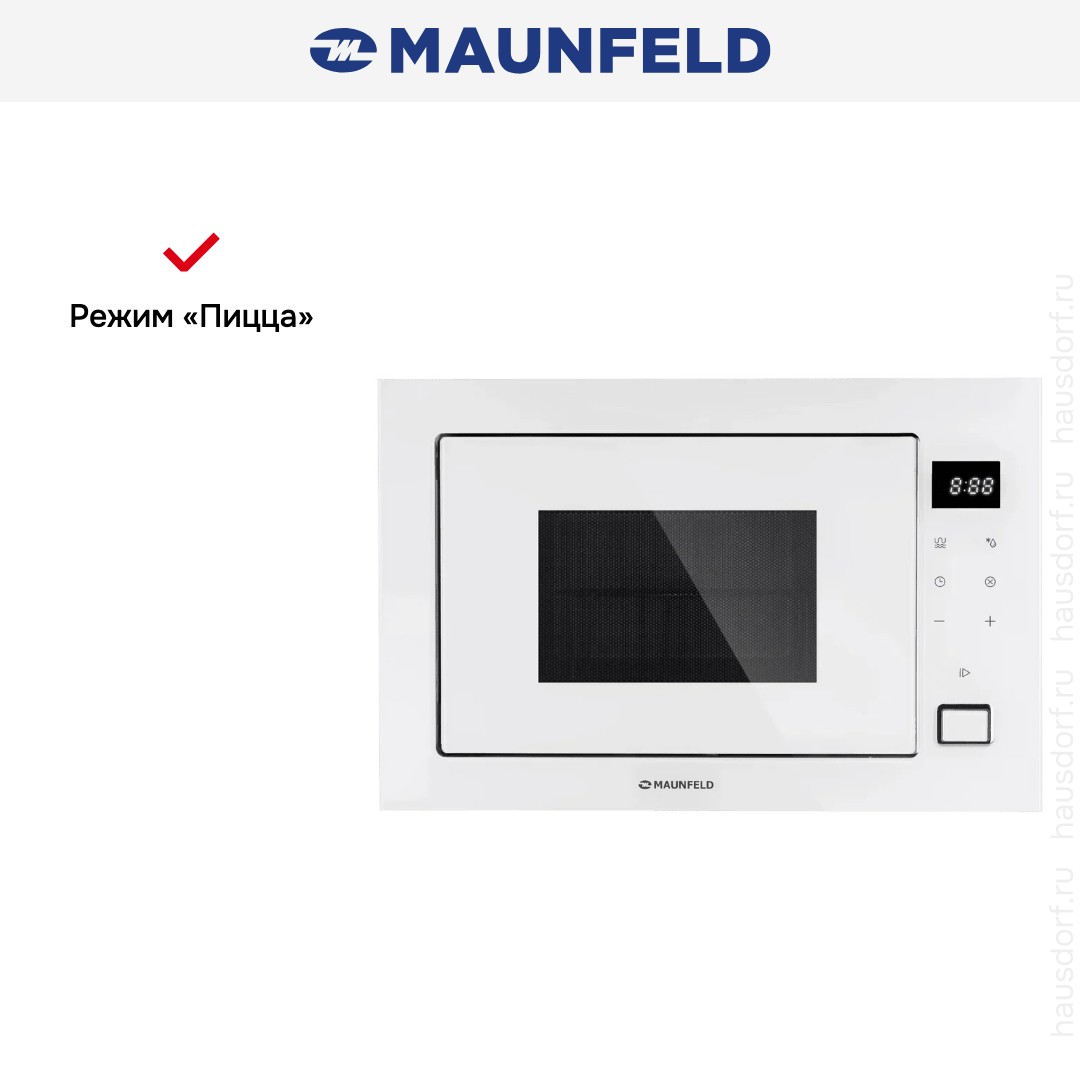 Встраиваемая микроволновая печь Maunfeld MBMO925SGW11 предлагает объём камеры 25 л и аккуратный белый корпус, который легко впишется в любой кухонный гарнитур. Благодаря сплошному застеклению дверцы прибор выглядит современно и держит единый стиль фронтальной поверхности.