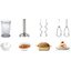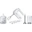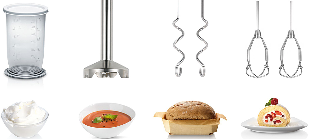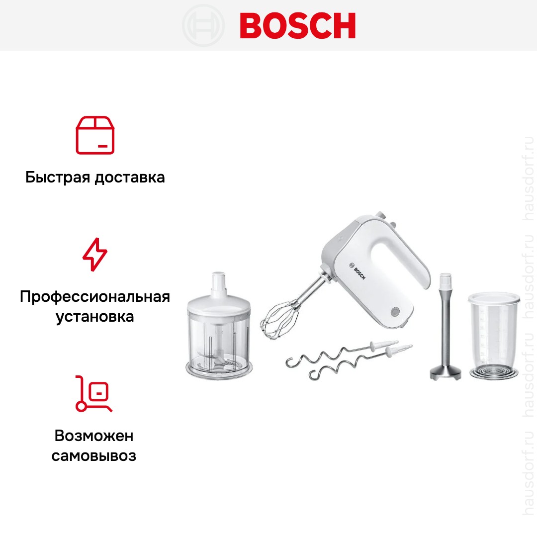 Обратите внимание на цвет миксера Бош — белый — он может стать как гармоничным дополнением кухонной обстановки, так и ярким акцентом. В комплекте с самим прибором идут дополнительные элементы: венчик для взбивания, измельчитель, крюки для теста, мерный стакан с крышкой, насадка-блендер.