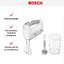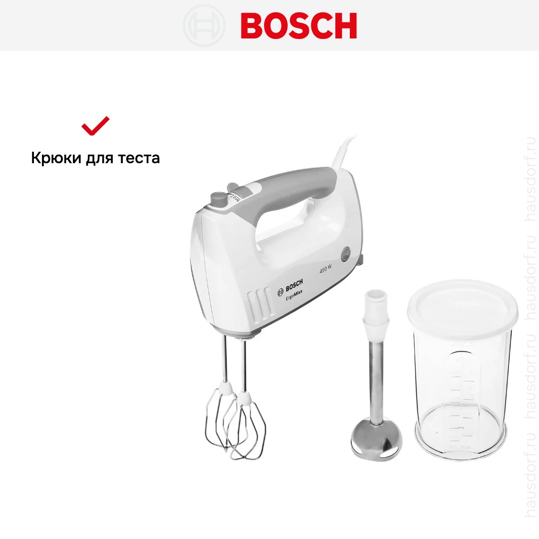 Обратите внимание на цвет миксера Бош — белый — он может стать как гармоничным дополнением кухонной обстановки, так и ярким акцентом. В комплекте с самим прибором идут дополнительные элементы: венчик для взбивания, крюки для теста, мерный стакан с крышкой, насадка-блендер.