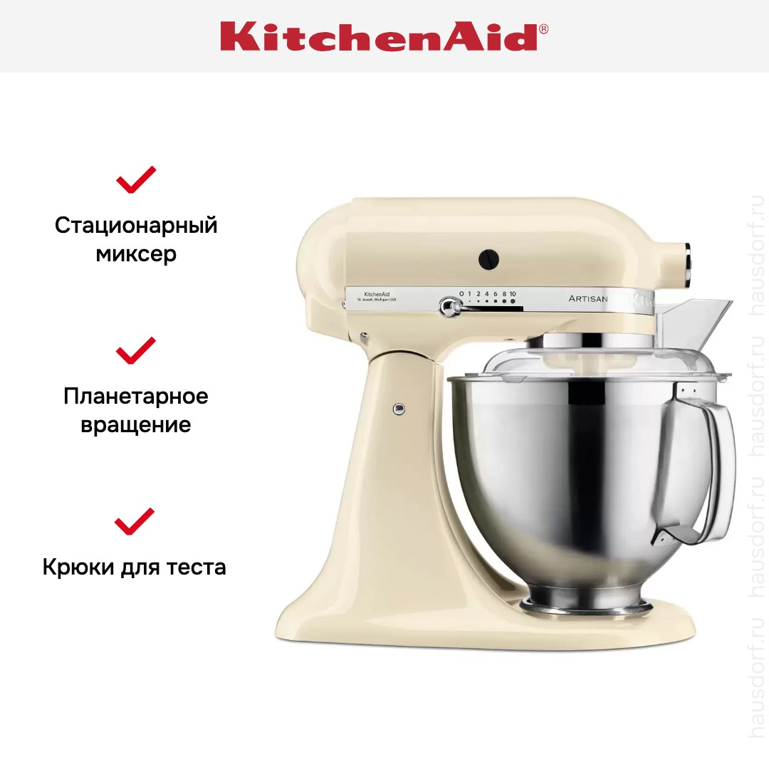 Обратите внимание на цвет миксера Китчен Эйд — кремовый — он может стать как гармоничным дополнением кухонной обстановки, так и ярким акцентом. В комплекте с самим прибором идут дополнительные элементы: венчик для взбивания, крюки для теста, насадка-лопатка для перемешивания, чаша из нержавеющей стали объемом 3 л, прозрачный защитный обод.
