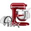 Обратите внимание на цвет миксера Китчен Эйд — красный — он может стать как гармоничным дополнением кухонной обстановки, так и ярким акцентом. В комплекте с самим прибором идут дополнительные элементы: венчик для взбивания, крюки для теста, насадка-лопатка для перемешивания, лопатка с гибким ребром, защитный обод. Также производитель предусмотрел вариант расширения функционала до кухонного комбайна.