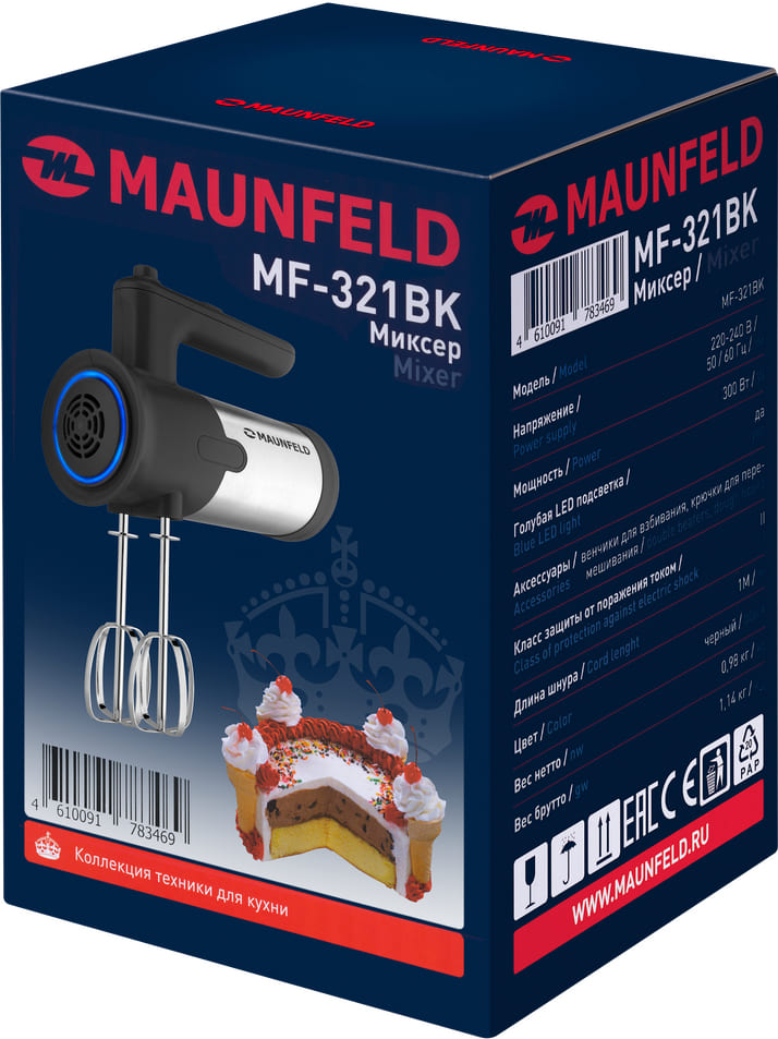 Ручной миксер Maunfeld обладает стандартной мощностью, требует вашего участия в работе — необходимо направлять насадку для грамотного взбивания и смешивания. Доступное количество скоростей — 5 шт.