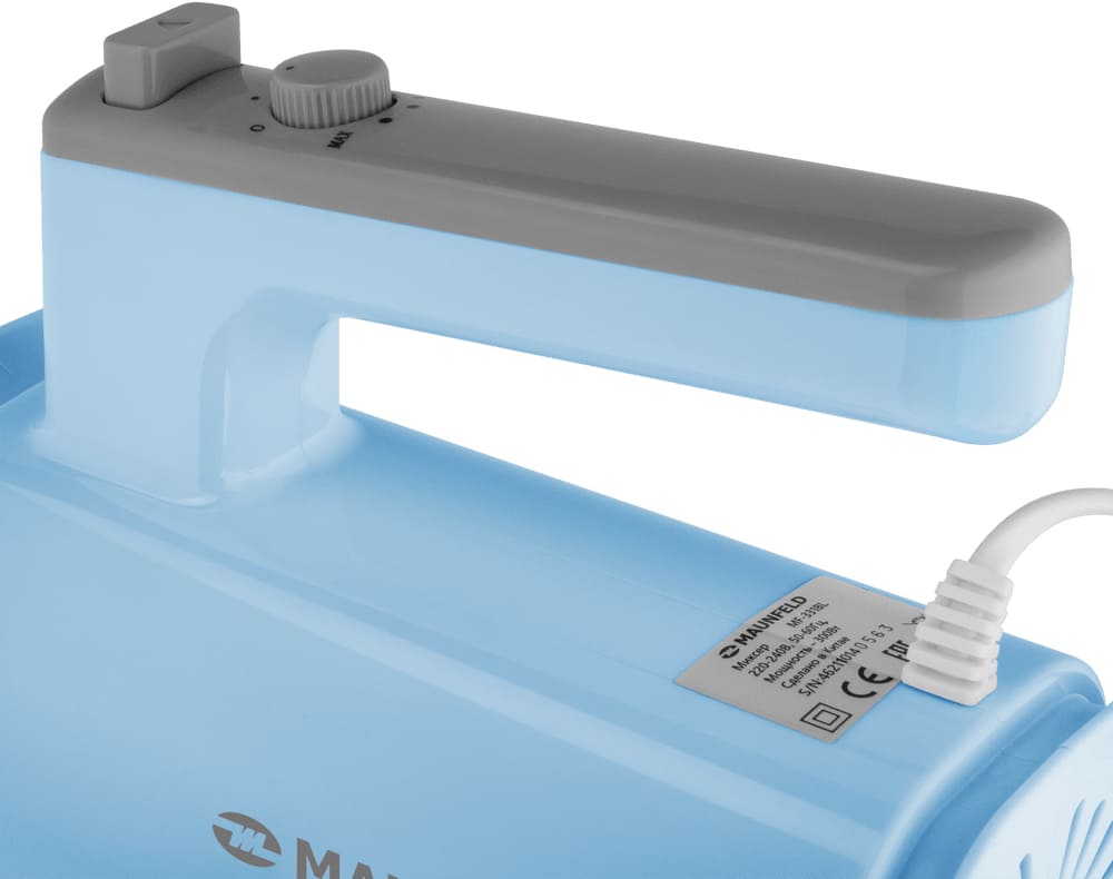 Обратите внимание на цвет миксера Маунфилд — голубой — он может стать как гармоничным дополнением кухонной обстановки, так и ярким акцентом. В комплекте с самим прибором идут дополнительные элементы: венчик для взбивания, крюки для теста.