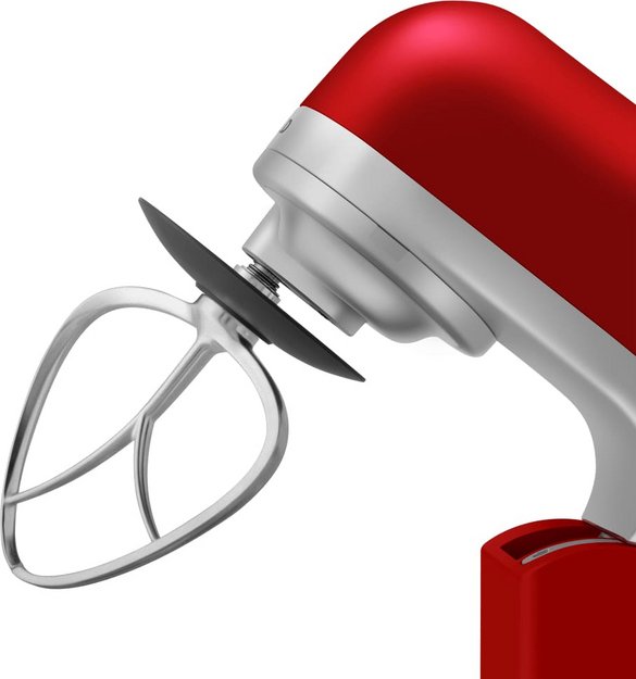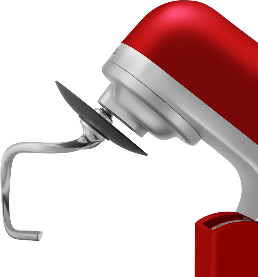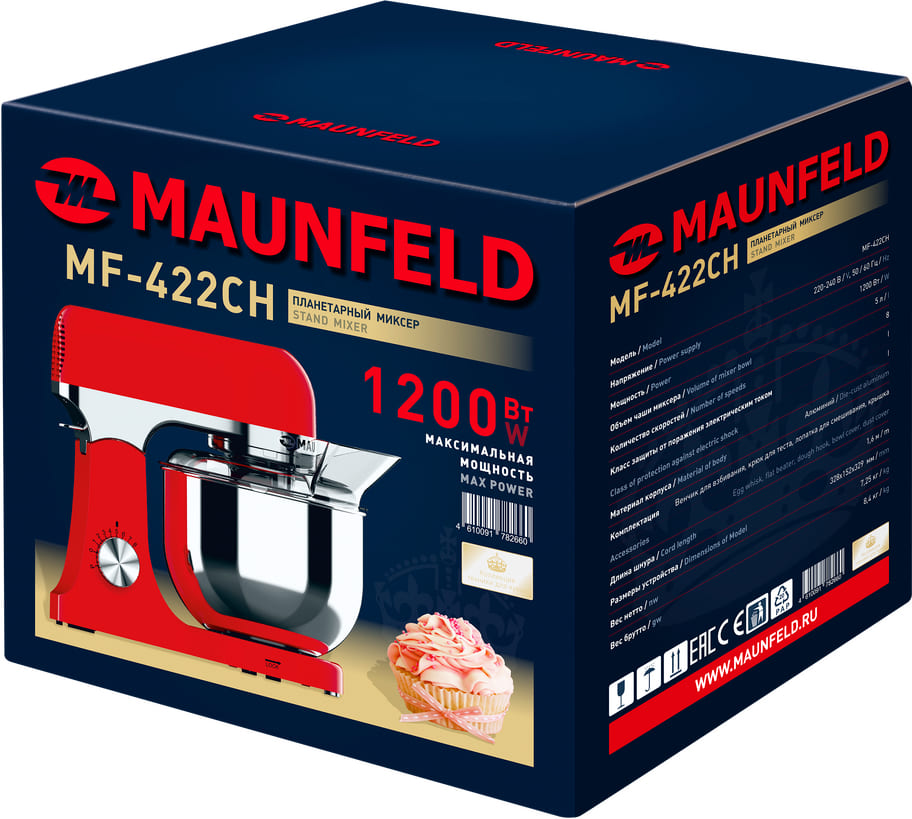 Обратите внимание на цвет миксера Маунфилд — вишня — он может стать как гармоничным дополнением кухонной обстановки, так и ярким акцентом. В комплекте с самим прибором идут дополнительные элементы: венчик для взбивания, защитный обод с воронкой для засыпания продуктов, крюки для теста, насадка-лопатка для перемешивания.
