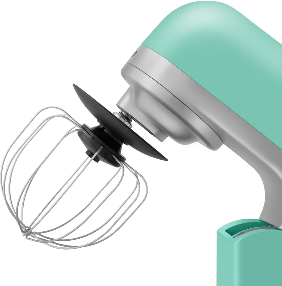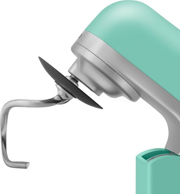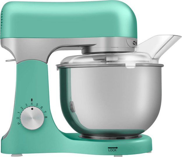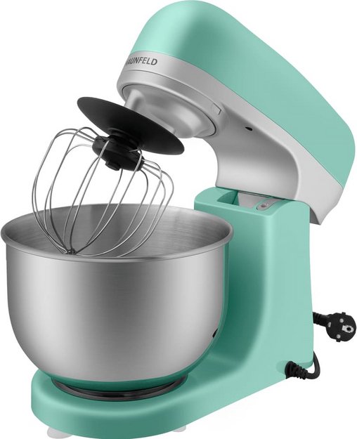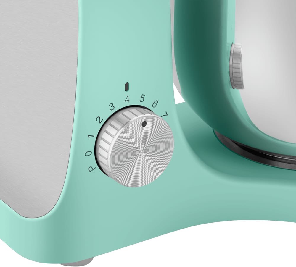 Обратите внимание на цвет миксера Маунфилд — зеленый — он может стать как гармоничным дополнением кухонной обстановки, так и ярким акцентом. В комплекте с самим прибором идут дополнительные элементы: венчик для взбивания, защитный обод с воронкой для засыпания продуктов, крюки для теста, насадка-лопатка для перемешивания.