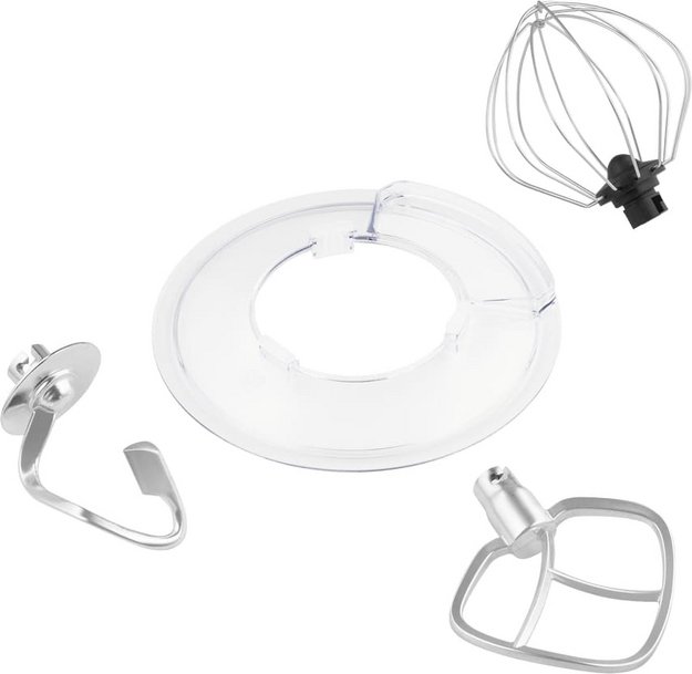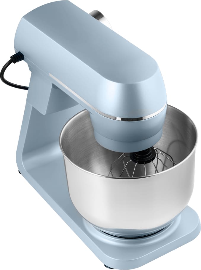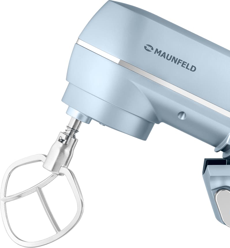 Обратите внимание на цвет миксера Маунфилд — голубой — он может стать как гармоничным дополнением кухонной обстановки, так и ярким акцентом. В комплекте с самим прибором идут дополнительные элементы: венчик для взбивания, защитный обод с воронкой для засыпания продуктов, крюки для теста, насадка-лопатка для перемешивания.