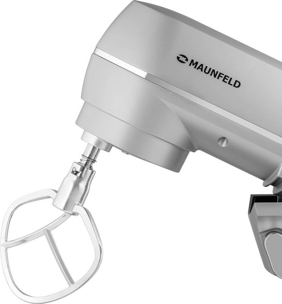 Обратите внимание на цвет миксера Маунфилд — нержавеющая сталь — он может стать как гармоничным дополнением кухонной обстановки, так и ярким акцентом. В комплекте с самим прибором идут дополнительные элементы: венчик для взбивания, защитный обод с воронкой для засыпания продуктов, крюки для теста, насадка-лопатка для перемешивания.