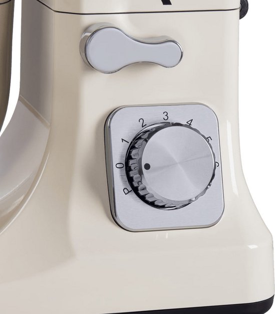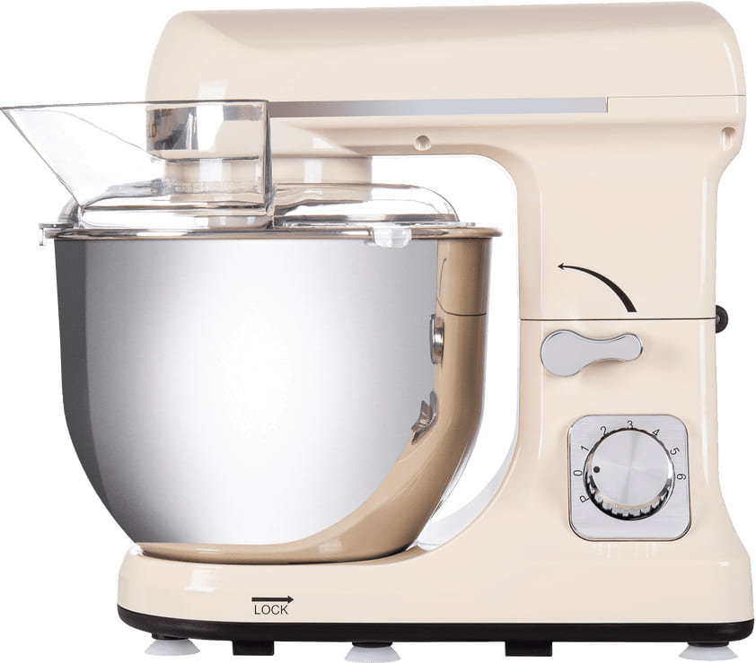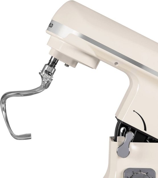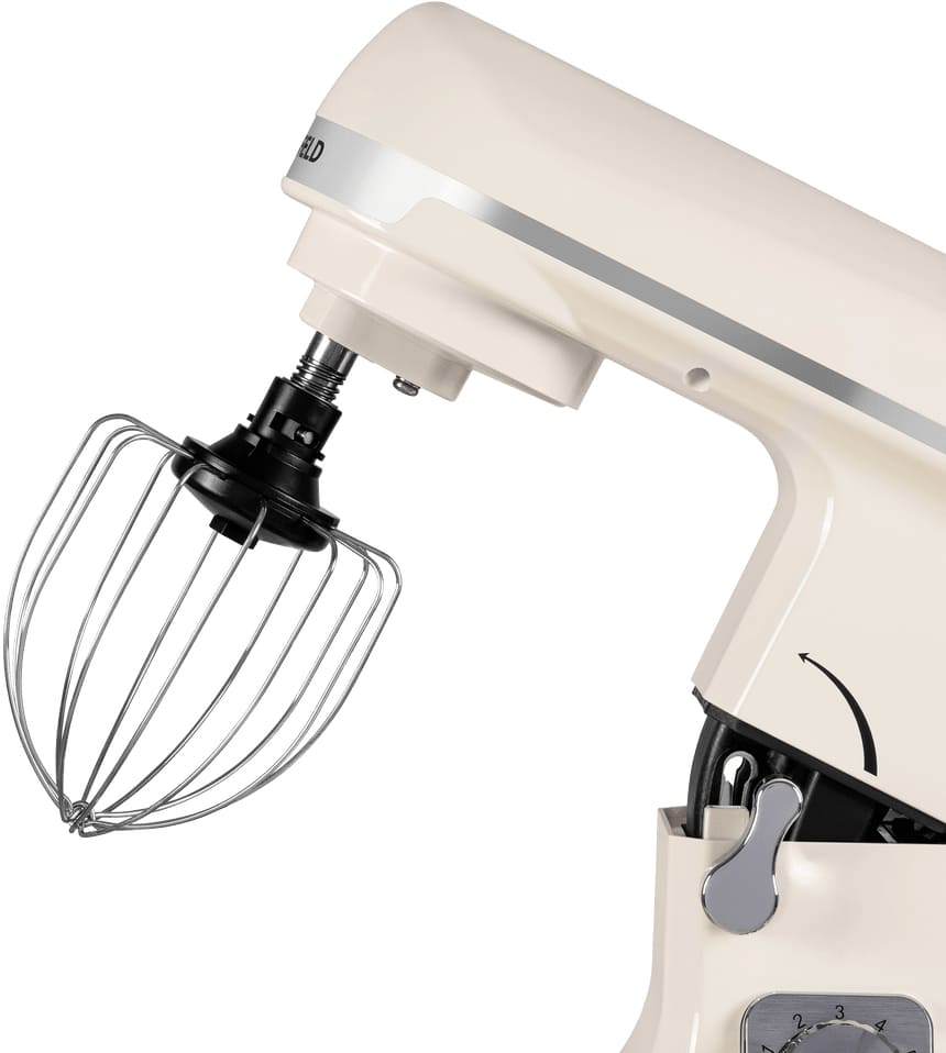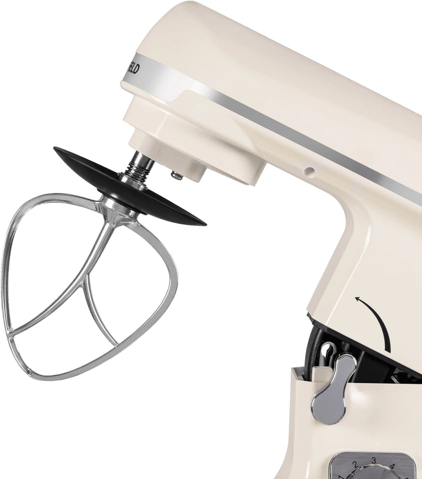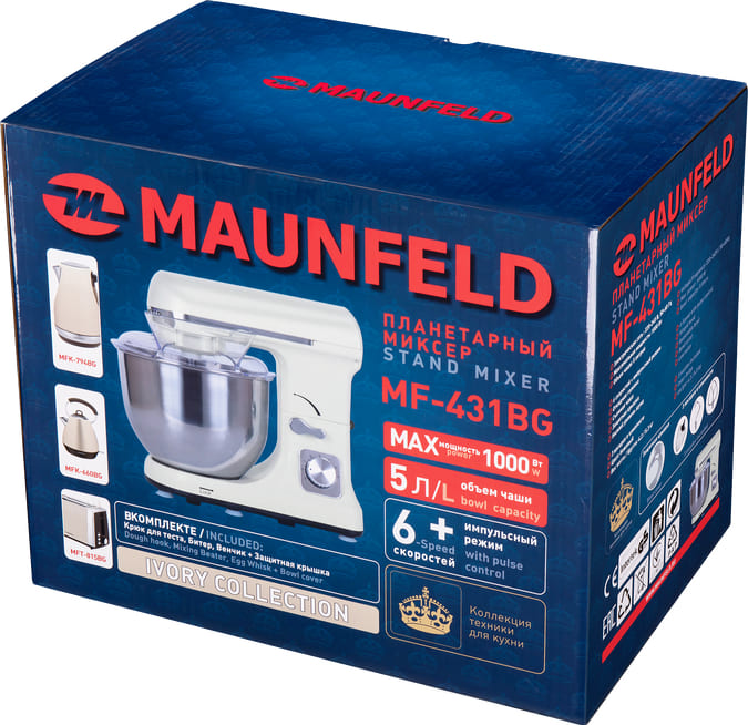 Обратите внимание на цвет миксера Маунфилд — бежевый — он может стать как гармоничным дополнением кухонной обстановки, так и ярким акцентом. В комплекте с самим прибором идут дополнительные элементы: венчик для взбивания, защитный обод с воронкой для засыпания продуктов, крюки для теста, насадка-лопатка для перемешивания.