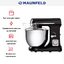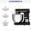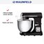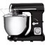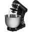 Модель выглядит лаконично: корпус черного цвета выполнен из пластика, а большая стальная чаша добавляет выразительную деталь. Пропорции продуманы — при габаритах 31×27×34.5 см техника занимает не слишком много места на столешнице. Благодаря нескользящим ножкам прибор устойчиво стоит даже при интенсивной работе, что добавляет спокойствия при замесе или взбивании.