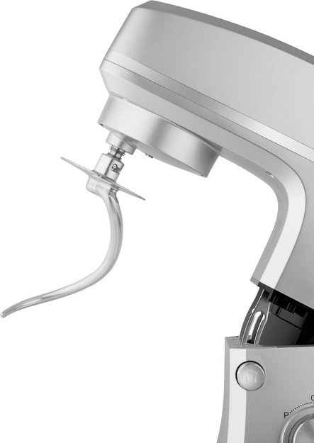 Обратите внимание на цвет миксера Маунфилд — нержавеющая сталь — он может стать как гармоничным дополнением кухонной обстановки, так и ярким акцентом. В комплекте с самим прибором идут дополнительные элементы: венчик для взбивания, защитный обод с воронкой для засыпания продуктов, крюки для теста, насадка-лопатка для перемешивания.