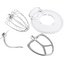 В комплекте идут венчик для взбивания, крюки для теста и лопатка для перемешивания, а также защитный обод с воронкой для удобной засыпки ингредиентов. Пластиковый корпус легче металлического аналога и устойчив к механическим нагрузкам, а поверхность без труда очищается от следов муки и крема. Чаша из нержавейки не впитывает запахи, устойчива к коррозии и выдерживает высокие нагрузки при интенсивном использовании.