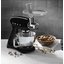 Smeg SMF03BLEU — стационарный миксер линейки «Стиль 50-х» от компании Smeg. Это стильная, мощная и функциональная машина итальянского производства станет украшением вашей кухни. Благодаря элегантному облику она впишется в любой кухонный интерьер от классики до современных направлений, вроде хай-тека, лофта и даже таких стилей, как скандинавия и прованс. Цвет миксера — черный, корпус изготовлен из высокопрочного литого алюминия. Нескользящие ножки создают дополнительный комфорт и надежность установки во время работы миксера.