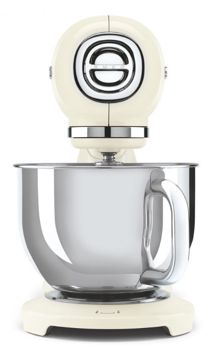 Обратите внимание на цвет миксера Смег — кремовый — он может стать как гармоничным дополнением кухонной обстановки, так и ярким акцентом. В комплекте с самим прибором идут дополнительные элементы: венчик для взбивания, защитная крышка на чашу, крюки для теста, лопатка с гибким ребром. Вы можете приобрести и установить другие насадки, для них создано специальное гнездо.