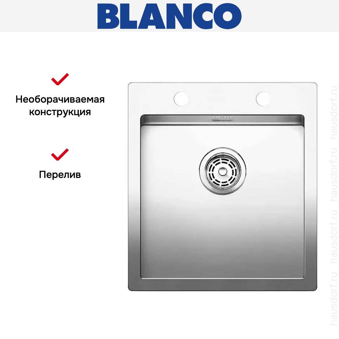 Обратите внимание на дизайнерские отличия мойки Бланко, которые помогут в создании идеальной кухни в вашем доме. Она выполнена в цвете нержавеющая сталь. Основной материал — нержавеющая сталь, он гарантирует надежность и долгие годы службы без повреждений. У этого покрытия приятная полированная текстура.