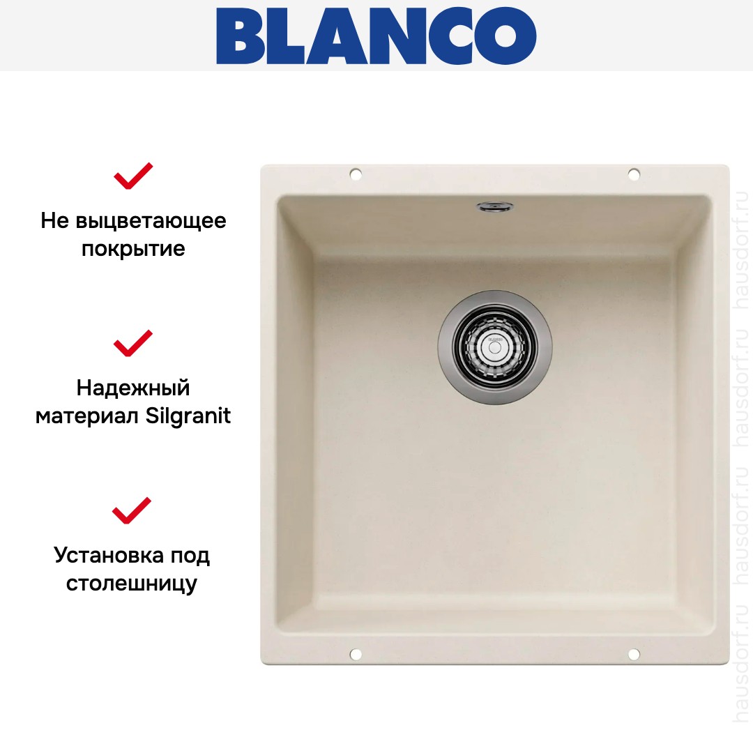 Обратите внимание на дизайнерские отличия мойки Бланко, которые помогут в создании идеальной кухни в вашем доме. Она выполнена в цвете мягкий белый. Основной материал — Silgranit, он гарантирует надежность и долгие годы службы без повреждений.