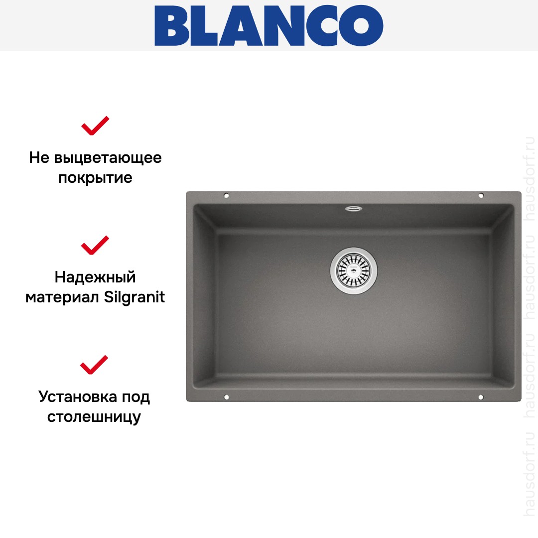Врезная мойка Blanco — отличный выбор для тех, кто хочет создать гармоничное кухонное пространство с полностью вписывающейся в него сантехникой. Преимущество такой конструкции — плотное прилегание к столешнице, так как вырез подбирается индивидуально под габариты модели. Под стыки не попадает вода, поэтому срок службы значительно увеличивается, пользоваться ей удобно и приятно. Данная модель имеет стандартную форму, поэтому подходит большинству пользователей. Устанавливается под столешницу, благодаря чему не остается стыков, в которых копились бы загрязнения, а также увеличивается рабочая глубина.