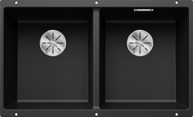 Мойка Blanco Subline 350/350-U Silgranit, черный — врезная прямоугольная модель под столешницу, созданная для современных кухонь с акцентом на строгую эстетику и практичность. Ее лаконичные линии и глубокий матовый цвет формируют выразительный контраст с светлыми столешницами и фасадами, не перегружая пространство. Подстольная установка делает рабочую поверхность визуально цельной и облегчает уборку, так как крошки и вода легко смахиваются прямо в чаши.