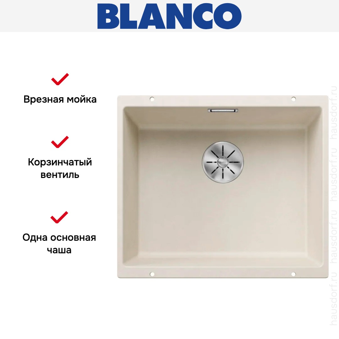 Врезная мойка Blanco — отличный выбор для тех, кто хочет создать гармоничное кухонное пространство с полностью вписывающейся в него сантехникой. Преимущество такой конструкции — плотное прилегание к столешнице, так как вырез подбирается индивидуально под габариты модели. Под стыки не попадает вода, поэтому срок службы значительно увеличивается, пользоваться ей удобно и приятно. Данная модель имеет стандартную форму, поэтому подходит большинству пользователей. Устанавливается под столешницу, благодаря чему не остается стыков, в которых копились бы загрязнения, а также увеличивается рабочая глубина.
