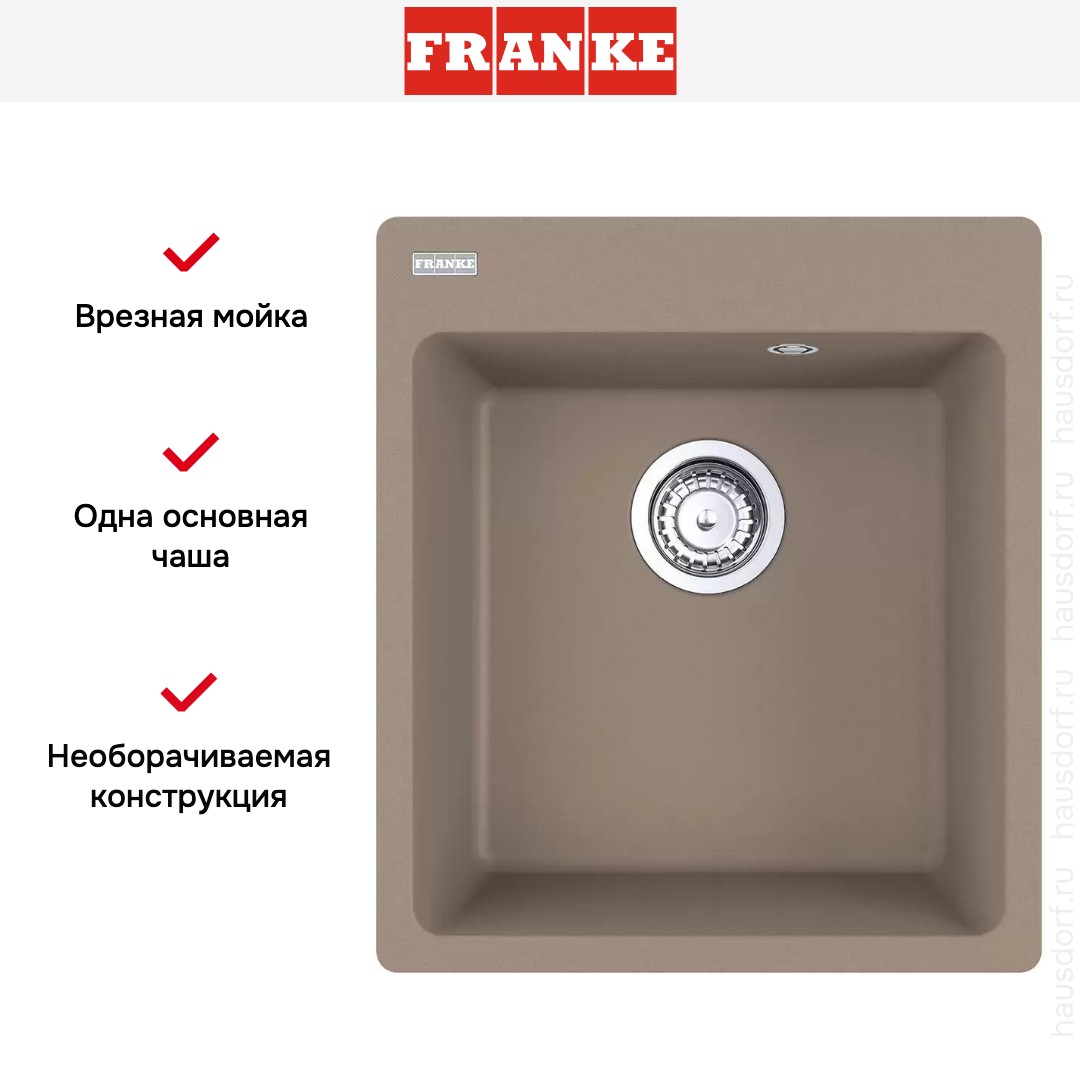 Обратите внимание на дизайнерские отличия мойки Франке, которые помогут в создании идеальной кухни в вашем доме. Она выполнена в цвете миндаль. Основной материал — фрагранит, он гарантирует надежность и долгие годы службы без повреждений.