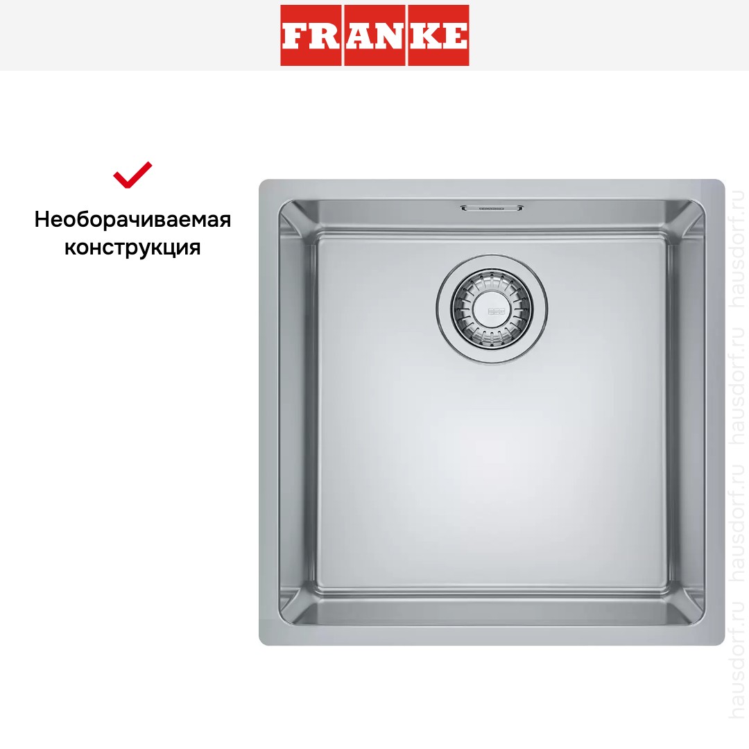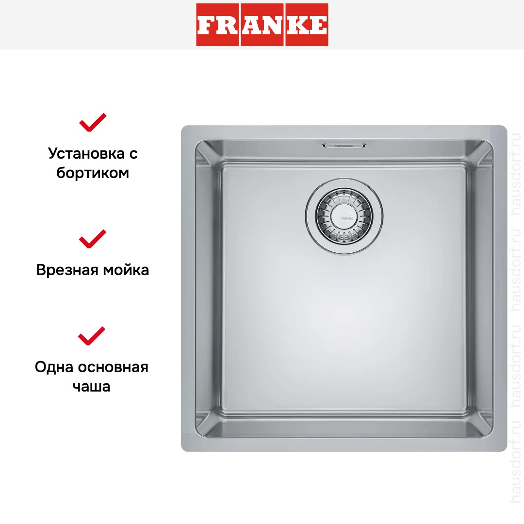 Врезная мойка Franke — отличный выбор для тех, кто хочет создать гармоничное кухонное пространство с полностью вписывающейся в него сантехникой. Преимущество такой конструкции — плотное прилегание к столешнице, так как вырез подбирается индивидуально под габариты модели. Под стыки не попадает вода, поэтому срок службы значительно увеличивается, пользоваться ей удобно и приятно. Данная модель имеет стандартную форму, поэтому подходит большинству пользователей.