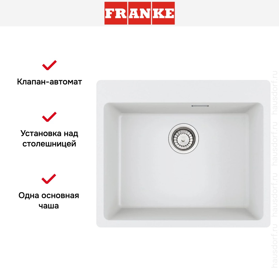 Мойка Franke MRG 610-54 FTL белый — накладная модель с прямоугольным силуэтом и лаконичным дизайном Maris, которая гармонично впишется в современный интерьер. Компактные габариты 59×50 см делают ее удобной для небольших кухонь и стандартных столешниц, а чистый белый цвет придает рабочей зоне чувство порядка и визуально расширяет пространство. Аккуратные скругления радиусом 1,5 см по контуру и 2 см на чаше смягчают геометрию и создают плавные переходы, что важно для аккуратного вида и простоты ухода.