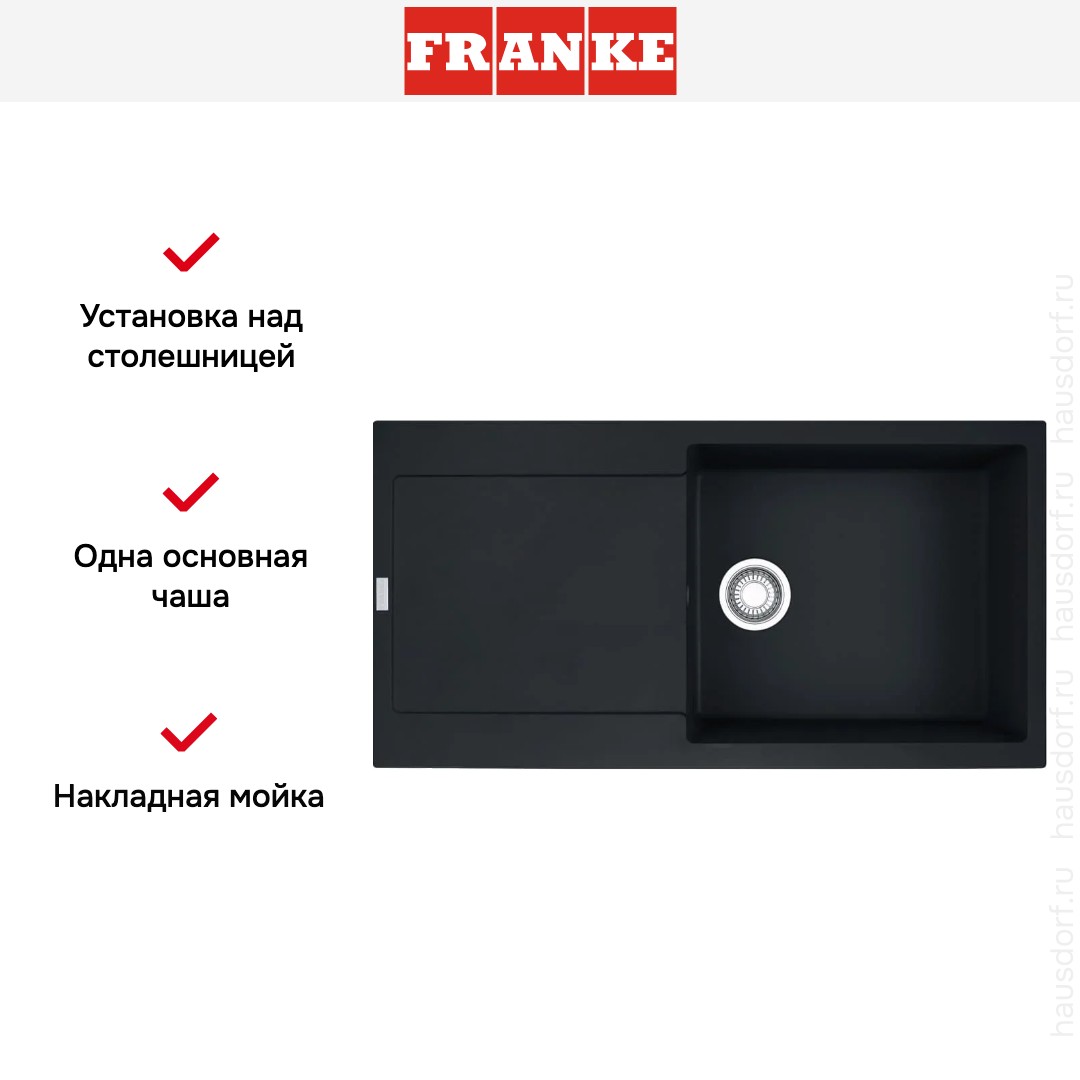 Мойка Franke MRG 611-97 чёрный представлена в строгом прямоугольном исполнении и сразу задаёт современный тон интерьеру кухни. Эта накладная модель устанавливается над столешницей и обеспечивает аккуратный вид по краю рабочей зоны. Габариты 97×50 см оптимальны для стандартной кухни и оставляют достаточно места для планировки техники и бытовых приборов.