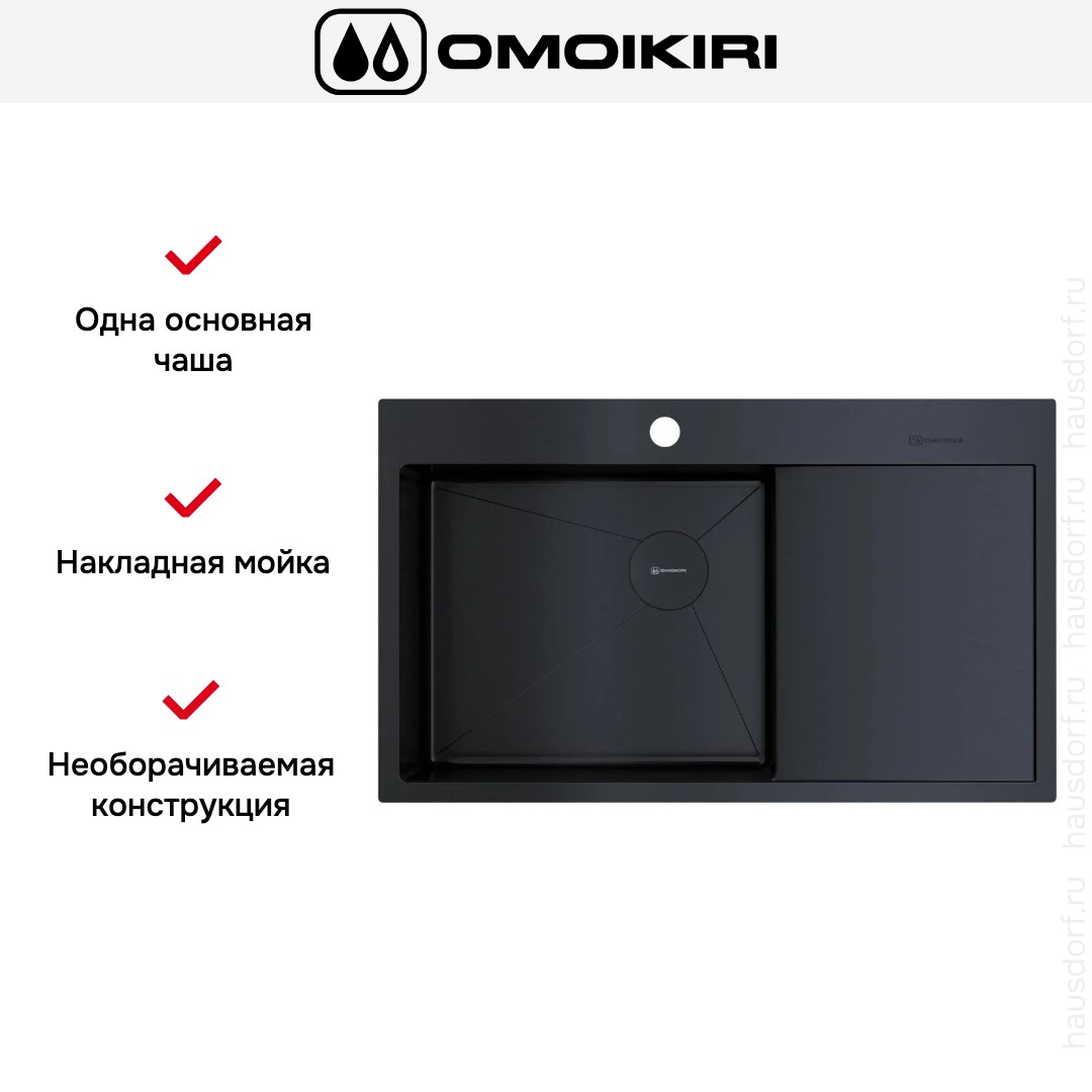 Мойка OMOIKIRI Akisame 86 Side GB-L — накладная прямоугольная модель в графитовом исполнении, разработанная для современных кухонь с открытой планировкой и строгими линиями. Её габариты 86×51 см позволяют органично вписаться в большинство столешниц, а монтаж над поверхностью делает установку быстрой и аккуратной. Обращайте внимание на фиксированную ориентацию конструкции: она не переворачивается, поэтому нужно заранее выбрать удобную сторону для крылья.