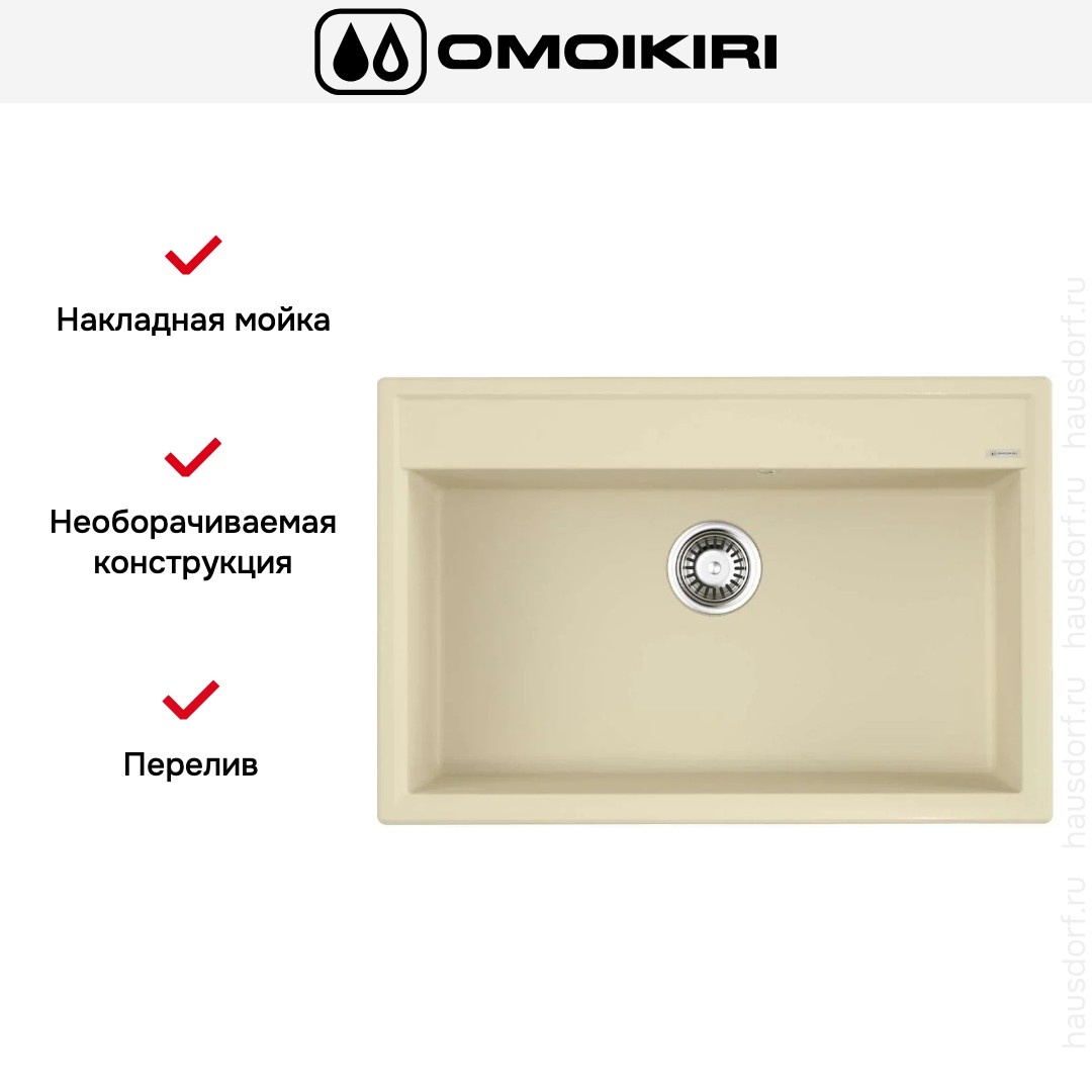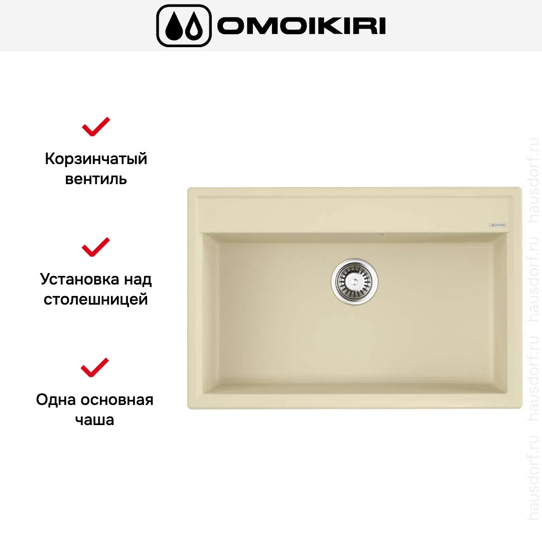 Мойка OMOIKIRI Daisen 77 BE — элегантное решение для кухни в тёплом ванильном цвете. Она подчёркивает интерьер, не перегружая пространство, и легко вписывается в разную по стилю обстановку. Прямоугольная форма создаёт лаконичный силуэт и обеспечивает удобную рабочую зону. Накладной способ установки упрощает монтаж и даёт возможность быстро заменить прибор без трудоемкой процедуры. Необорачиваемая конструкция рассчитана на фиксированное положение, что важно при продуманной планировке техники и коммуникаций.