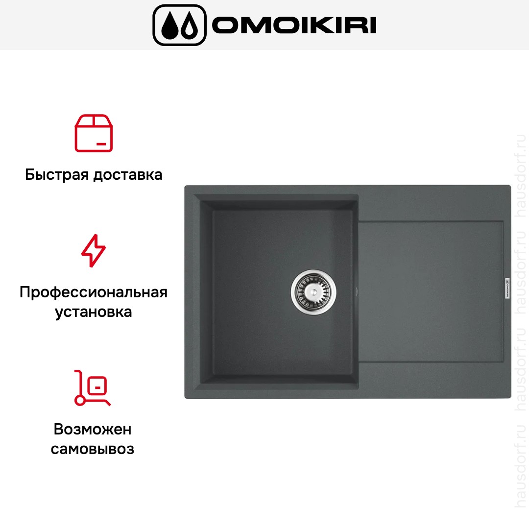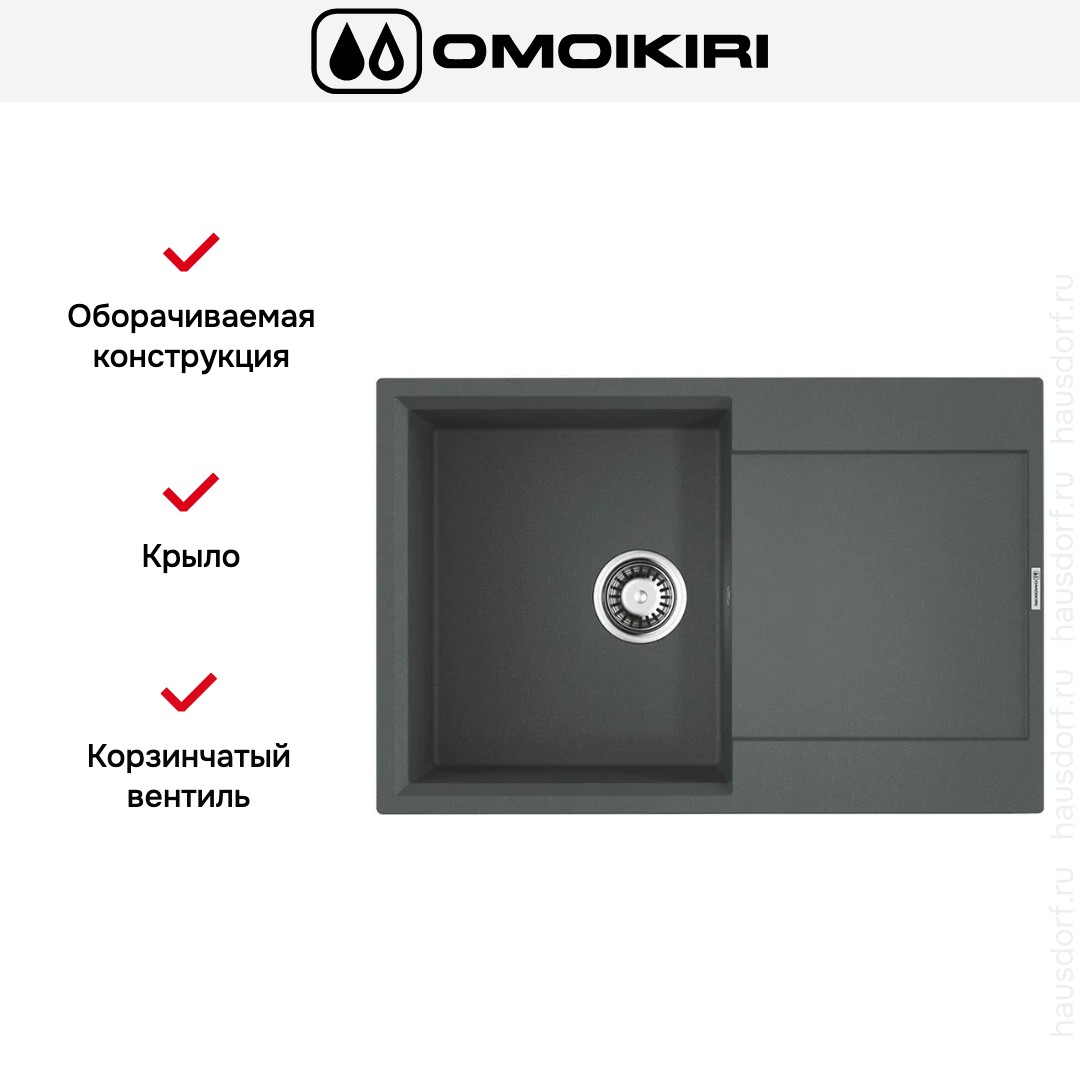 Мойка OMOIKIRI Daisen 78T GR — накладная прямоугольная модель с габаритами 7851 см. Она выполнена в спокойном цвете «Серый Ленинград». Устройство устанавливается над столешницей и идеально подходит для компактных кухонь и функциональных зон на даче.