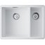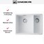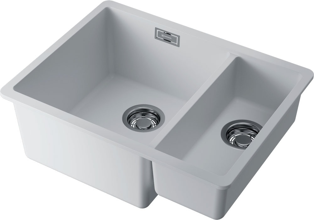 Выглядит лаконично и строго: прямоугольная форма, две продолговатые чаши в единой конструкции, универсальный белый цвет. Формат встраивания под столешницу создает ровную линию рабочей поверхности — без выступов и визуального «разрыва» между мойкой и поверхностью стола.
