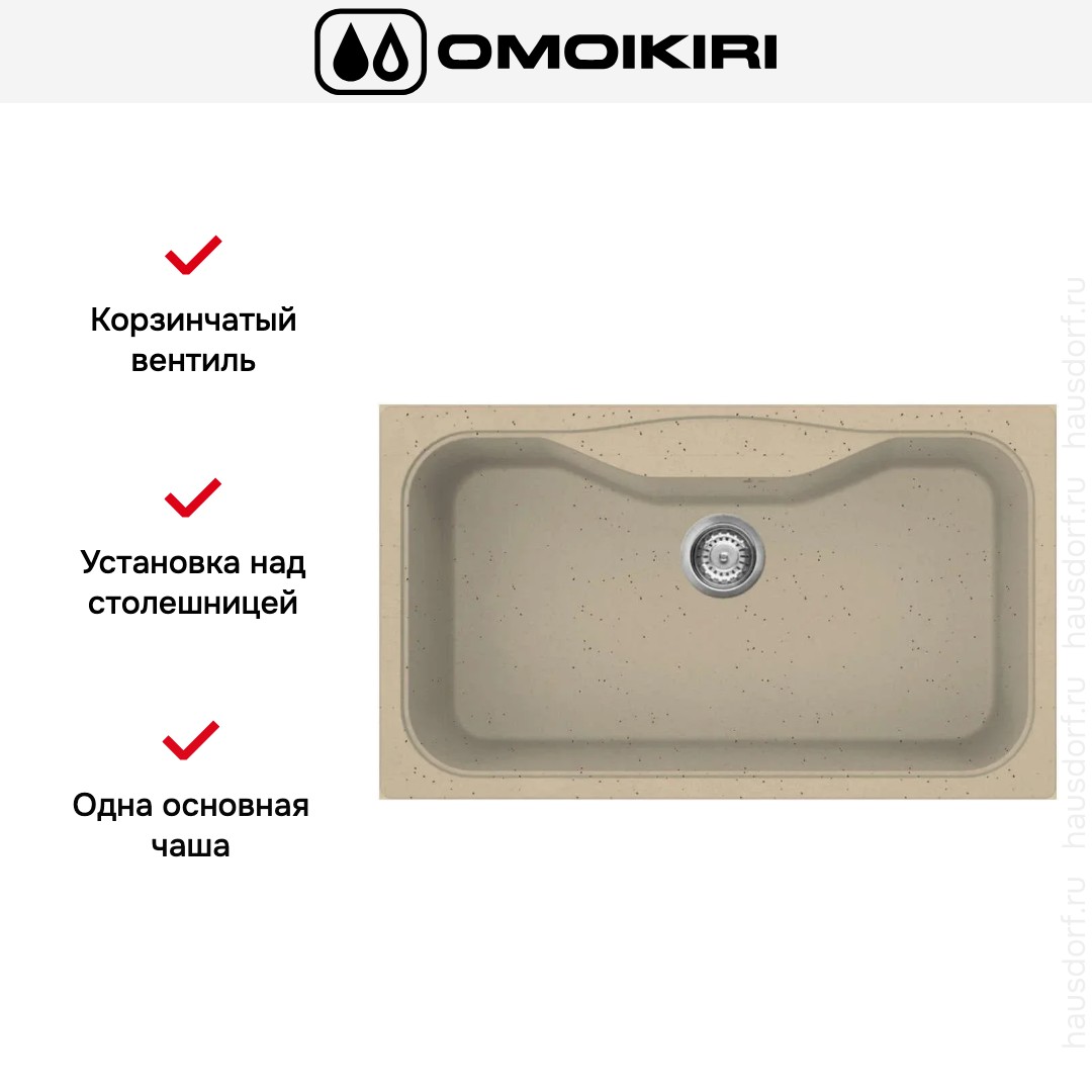 Особенности конструкции — необорачиваемый корпус, что важно учитывать при планировке размещения смесителя и дополнительных аксессуаров. Крепления для монтажа входят в набор, поэтому при правильной подготовке столешницы время установки минимально. Монолитная поверхность из композитного гранита устойчива к высоким температурам и не боится случайных ударов при обычной нагрузке.