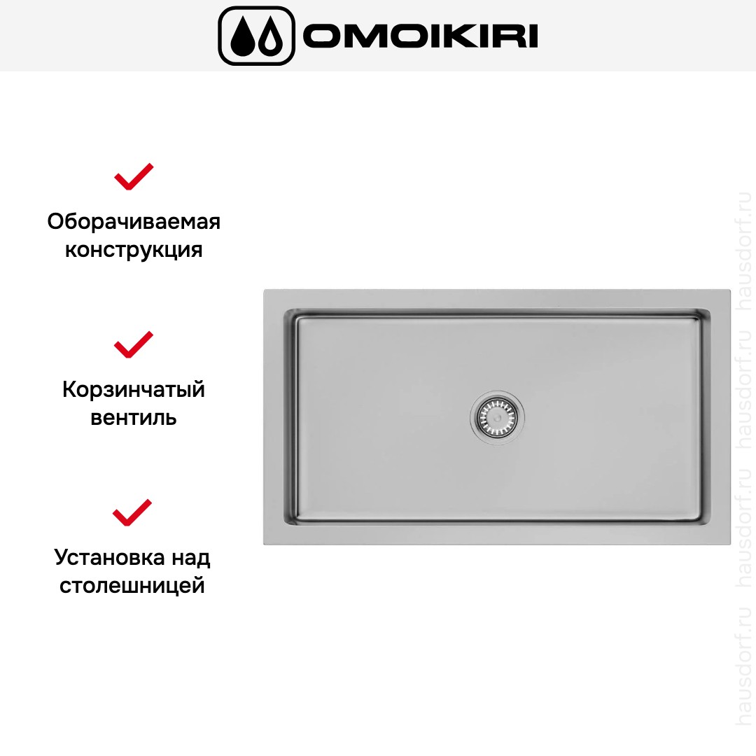 Мойка Omoikiri Mikura 83 SI Glossy — модульная прямоугольная мойка для установки над столешницей. Ее габариты 84×46 см делают модель удобной для стандартных кухонных зон. Ширина базы 90 см и монтажное отверстие 77×39 см упрощают подбор мебели и точную установку.