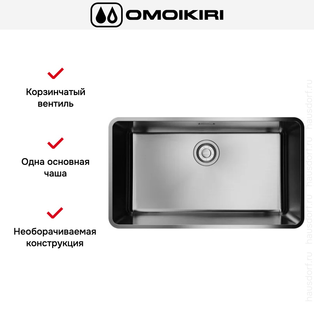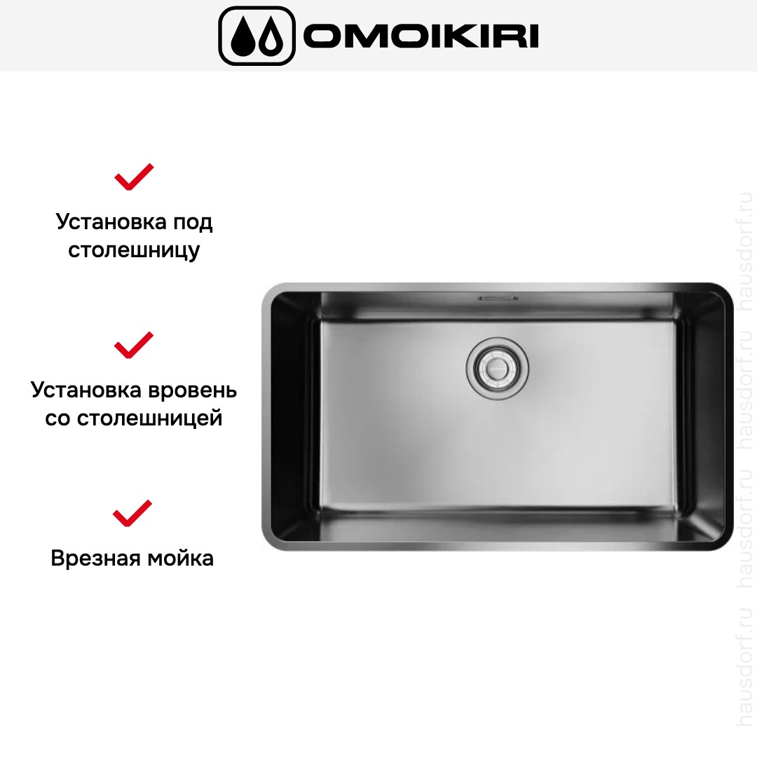 Мойка OMOIKIRI OMI-73-U I Ultra IN. Строгая прямоугольная форма и серебристый оттенок нержавеющей стали формируют современный и профессиональный внешний вид. PVD‑покрытие придаёт поверхности дополнительную стойкость к царапинам и меняет тактильные ощущения при касании. Ручной метод изготовления обеспечивает аккуратные швы и более тщательную обработку краёв по сравнению с массовым штампованием. Материал устойчив к высоким температурам и бытовой химии, поэтому сохраняет вид при обычной эксплуатации.