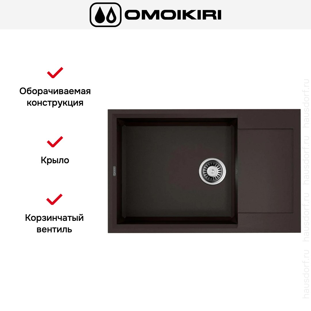Мойка Omoikiri Sakaime 78 LB DC представляет собой накладную прямоугольную модель размером 78 на 50 см и выполнена в тёмном шоколадном цвете. Визуально изделие выглядит лаконично и монолитно, что придаёт кухонной зоне аккуратность и глубину оттенка. Гладкие прямые линии и тонкий радиус углов делают силуэт строгим, но не тяжёлым, что помогает сочетать её с разными стилями столешниц и фасадов.