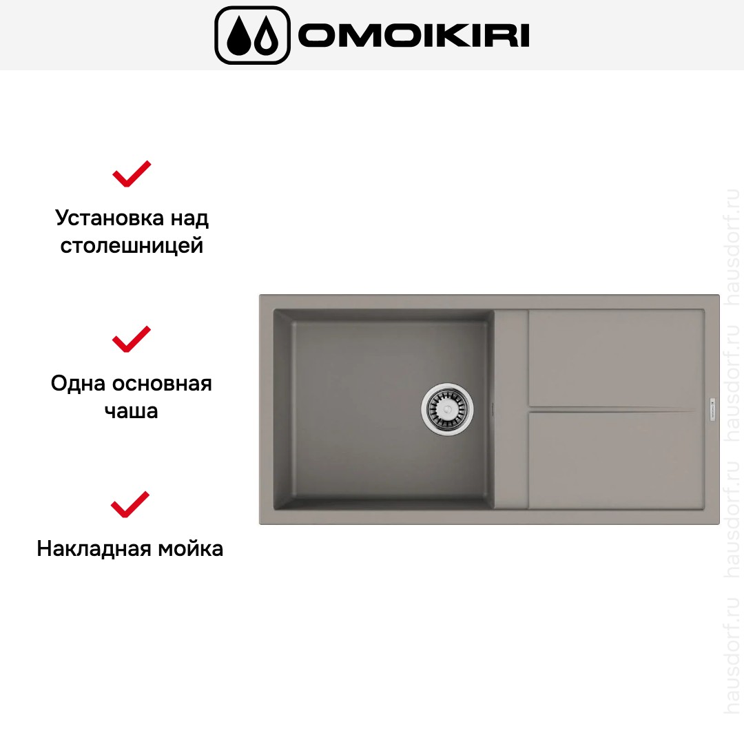 Накладная мойка Omoikiri — отличный выбор для тех, кто хочет создать гармоничное пространство с удобной сантехникой. простой в установке. Преимущество такой конструкции: легко подобрать практически к любой кухне и не придется демонтировать вместе с тумбой при ремонте или перестановке остальной мебели. Данная модель имеет стандартную форму, поэтому подходит большинству пользователей. Устанавливается над столешницей: это самый простой способ монтажа, зачастую с ним можно справиться даже без специалистов, главное — правильно рассчитать размеры ниши.