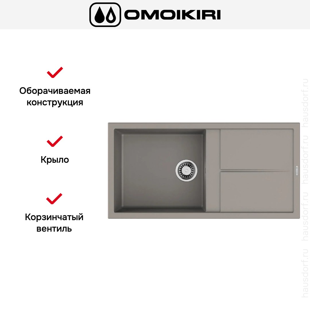 Обратите внимание на дизайнерские отличия мойки Омойкири, которые помогут в создании идеальной кухни в вашем доме. Она выполнена в цвете Серый Ленинград. Крыло, расположенное является дополнительным рабочим пространством, на котором можно сушить посуду, разделывать мясо и нарезать овощи.