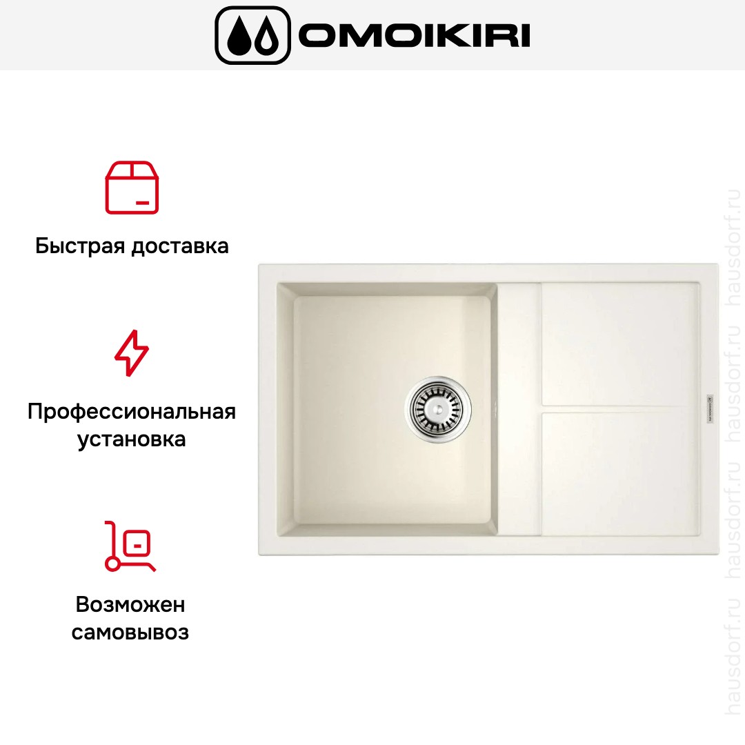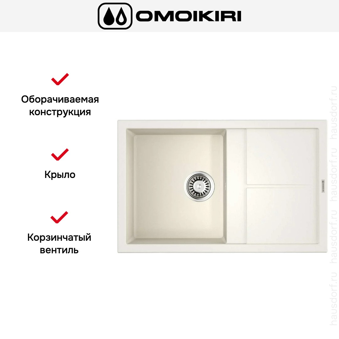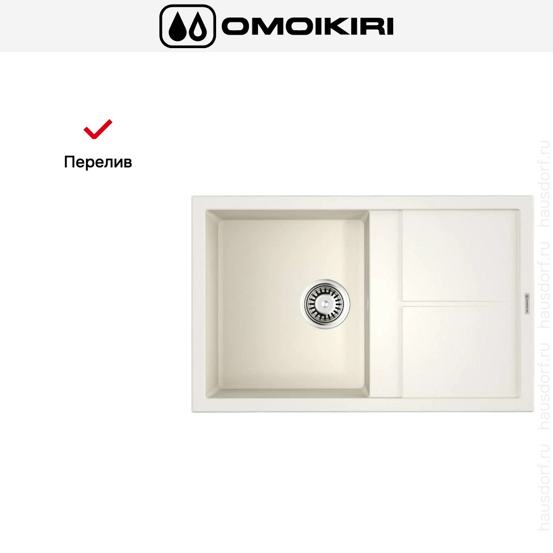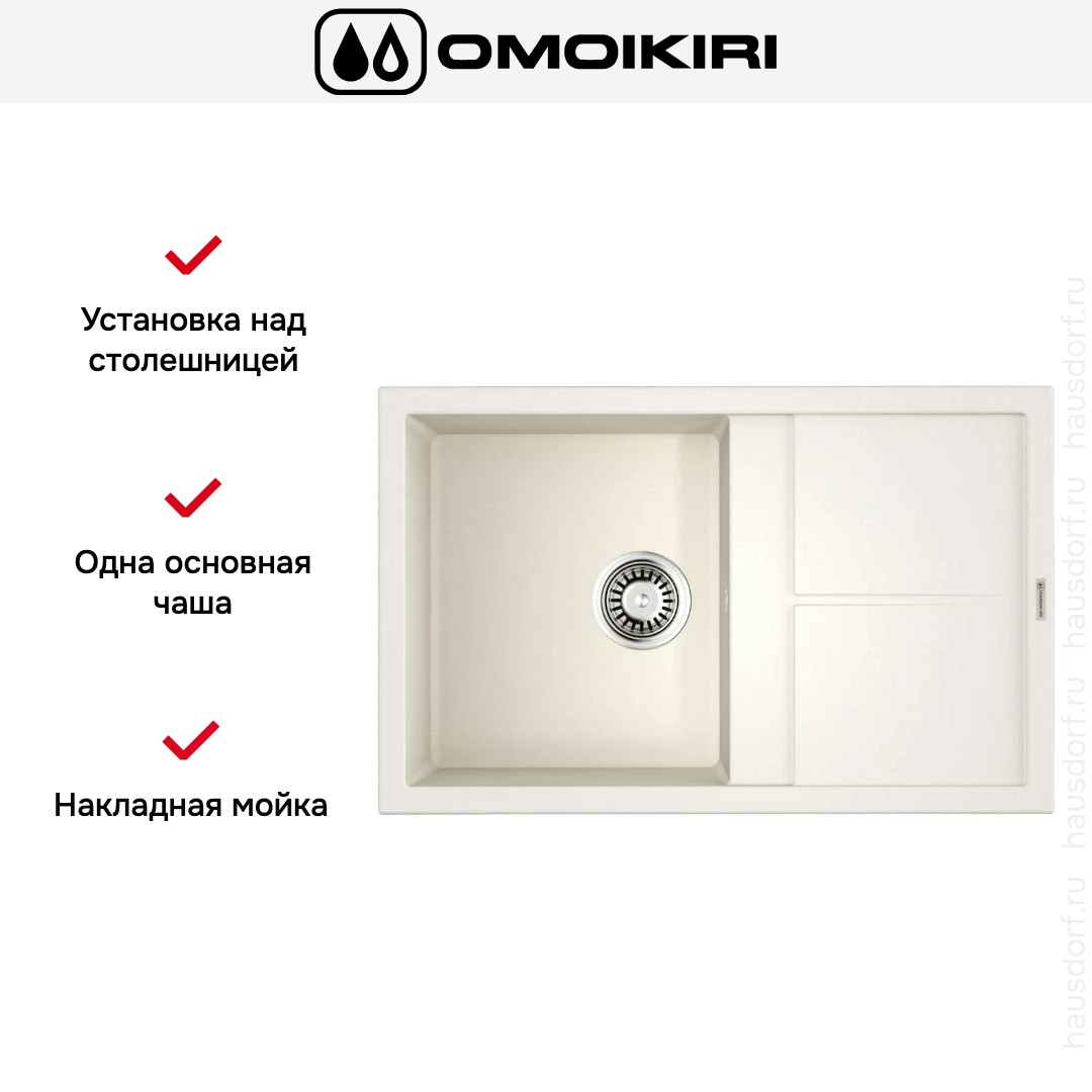 Мойка Omoikiri Sumi 79 WH — накладная модель прямоугольной формы с продуманной эргономикой и сдержанным эстетичным видом. Она подходит для современных кухонь в сканди- или минималистичном стиле благодаря чистым линиям и белому цвету, который визуально расширяет рабочее пространство.