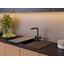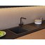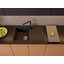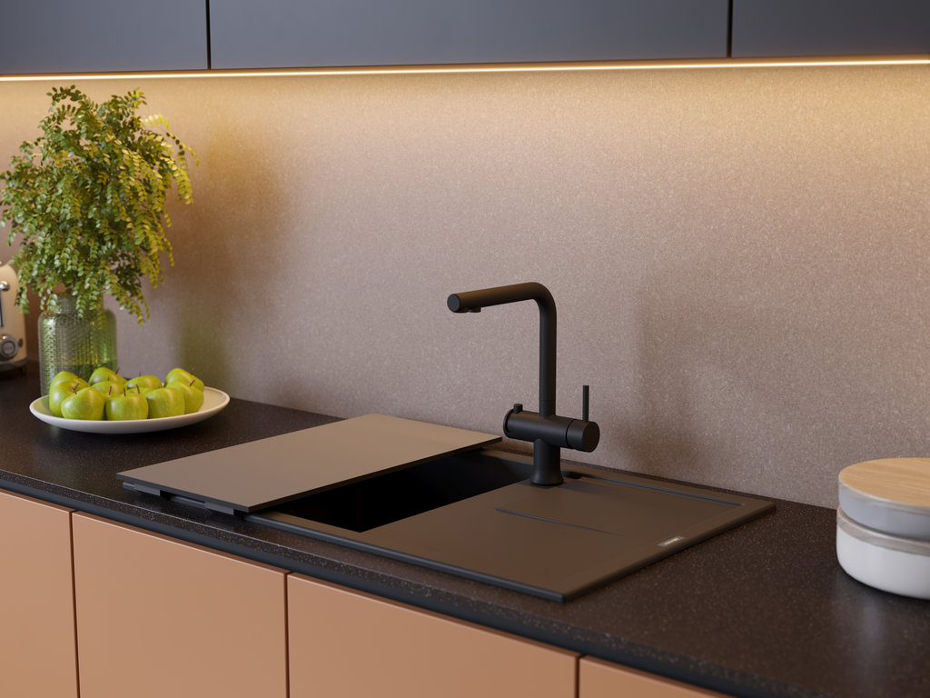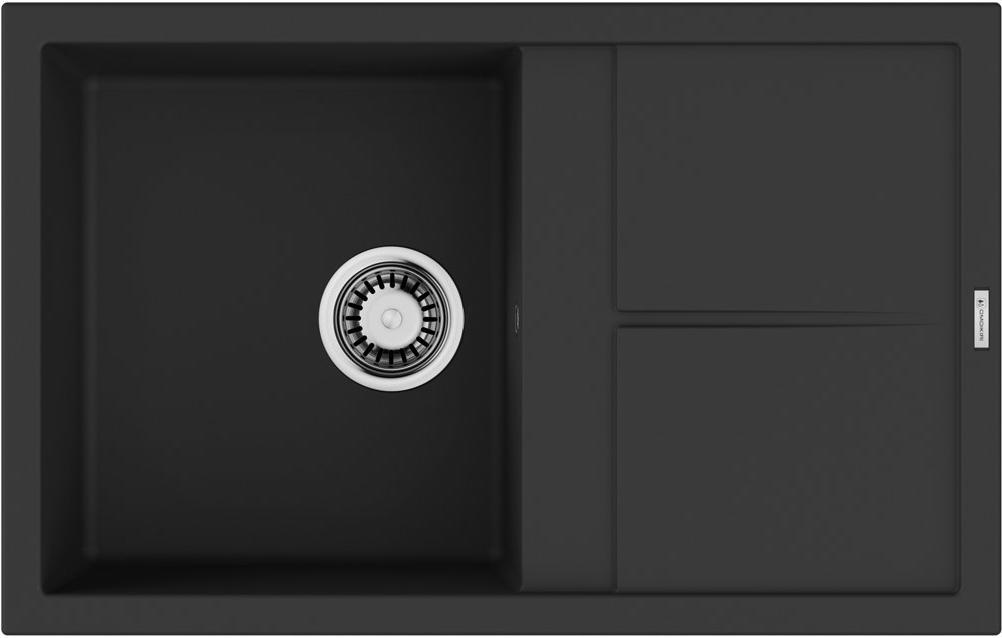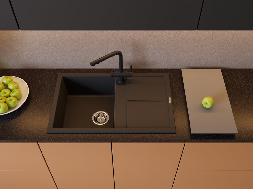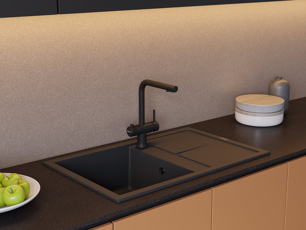 Выглядит лаконично: вытянутый прямоугольник 79×50 см с площадкой-крылом и глубокой чашей. Графитового цвета поверхность подчеркивает строгие очертания и прямые линии, она легко сочетается как со светлыми, так и с темными фасадами. Пропорции выверены: остается достаточно пространства на крыле для стекания воды и размещения посуды. Кромки ровные, линии чёткие, общий образ монолитный, без лишних деталей.