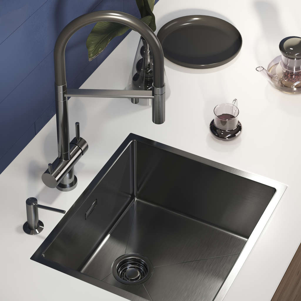 Корпус изготовлен из нержавеющей стали толщиной 1,2 мм и обработан PVD-покрытием, что повышает стойкость к царапинам и потускнению. Ручное производство гарантирует аккуратные швы и ровную кромку, а антивибрационные вставки уменьшают шум при работе с водой и посудой. Графитовый тон придает глубину интерьеру и менее марок по сравнению с классической полировкой.