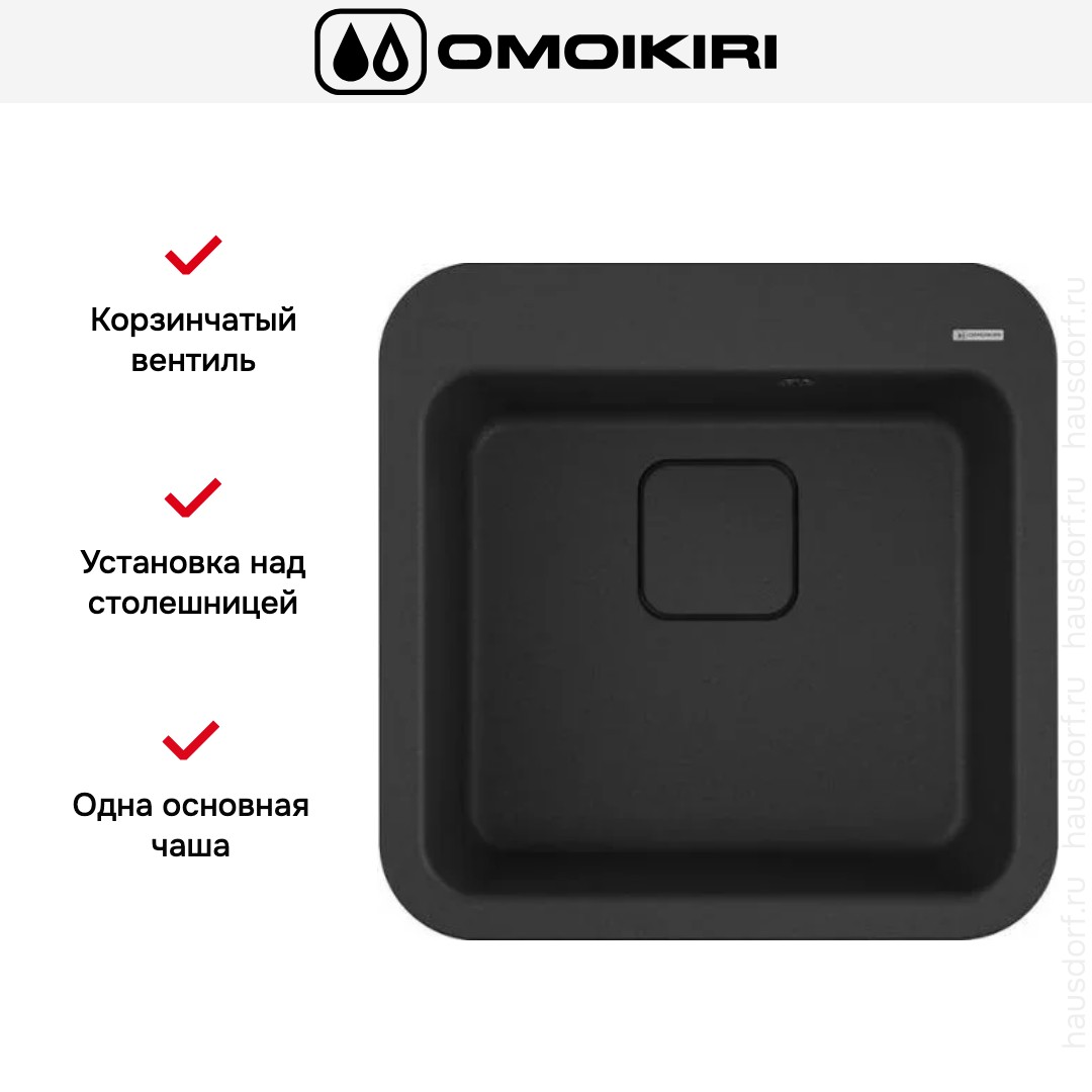 Мойка OMOIKIRI Tasogare 51 BL — накладная квадратная раковина, идеально подходящая для компактных или стильных кухонных зон. Ее строгие геометрические линии в черном цвете создают современный акцент и легко сочетаются с различными стилями столешниц. Плоская окантовка при установке над поверхностью добавляет рельефа рабочей зоне, а насыщенный тон дополняет минималистичные или контрастные интерьеры.