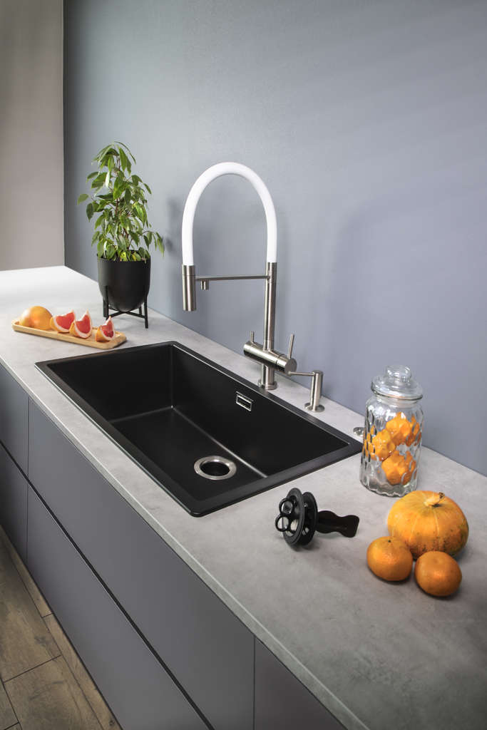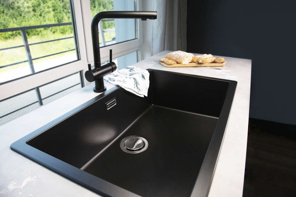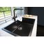 Прямоугольная кухонная мойка графитового цвета выглядит сдержанно и функционально. Четкие линии, прямые углы и ровные кромки формируют аккуратный контур рабочей зоны. Универсальный темный оттенок органично сочетается со столешницами любого тона.