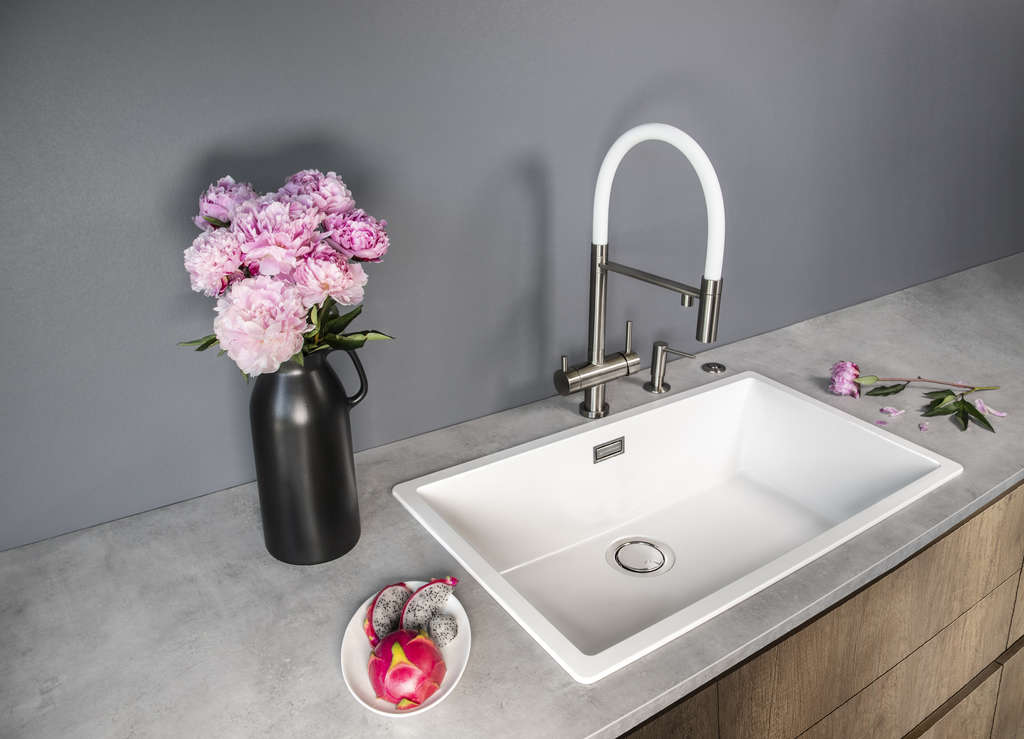 Интегрированная — встраиваемая модель из того же материала, что и столешница. Благодаря этому она выглядит как часть мебели.
