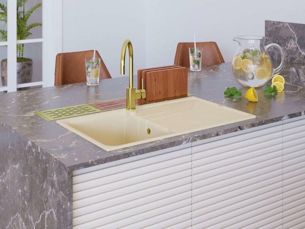 вровень со столешницей — создается ощущение бесшовного пространства, а если мойка сделана из того же материала, то и единого дизайна;