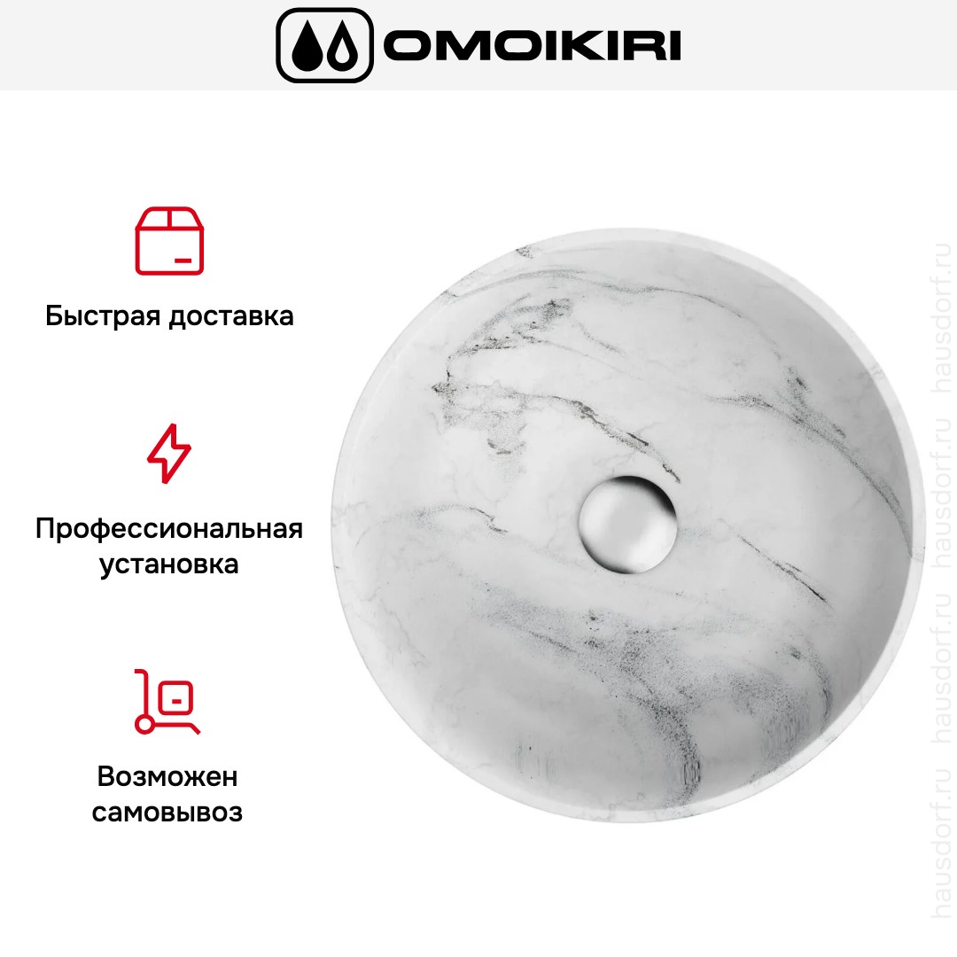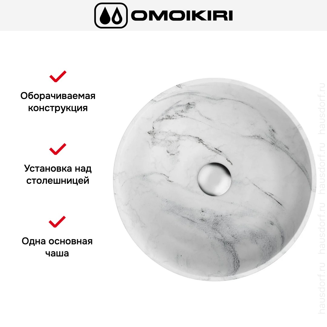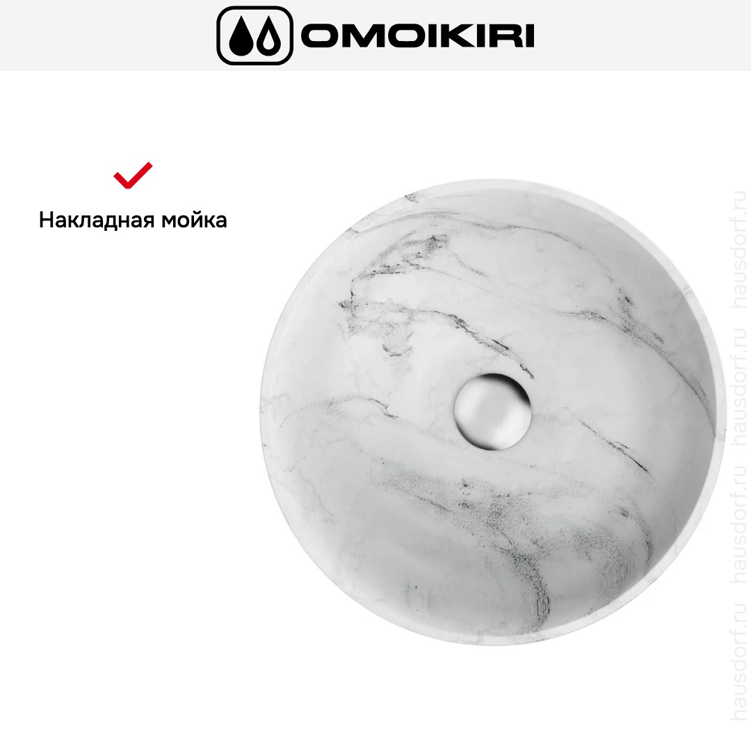 Мойка OMOIKIRI Hitomi WH Marble — элегантное решение для современной ванной комнаты. Строгая круглая форма в белом цвете делает изделие универсальным для любых интерьерных решений. Накладной способ установки подчеркивает декоративную рабочую поверхность столешницы, сохраняя лёгкость монтажа и обслуживания.