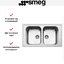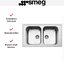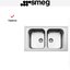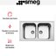 Врезная прямоугольная мойка Smeg LLR862-2 устанавливается на столешницу. Модель шириной 86 см изготовлена из нержавеющей стали толщиной 0,7 мм — недорогого, простого в очистке и долговечного материала. Две чаши шириной 40 см и глубиной 21 см с закругленными углами располагаются симметрично.