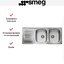 Прямоугольная мойка Smeg LYP116S сделана из нержавеющей стали, подходит любому дизайну кухни. Имеет две чаши глубиной 15 см, слева — крыло, на котором можно расположить сохнущую посуду. Благодаря сифону можно соединить мойку с посудомоечной или стиральной машиной.