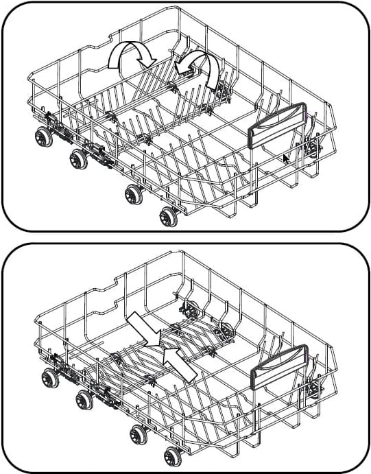 Верхняя корзина может регулироваться по высоте, так что при необходимости в нее можно поместить тарелки большего размера. Нижняя корзина позволяет установить вертикально большие суповые тарелки и блюда большого диаметра — для этого верхнюю корзину можно поднять выше. Тарелки обычно устанавливаются в откидные рамки-держатели, которые легко складываются на дно корзины. Всю посуду в нижней корзине рекомендуется устанавливать без соприкосновения предметов друг с другом, углублением к центру для более интенсивного воздействия струй воды на внутреннюю часть посуды.